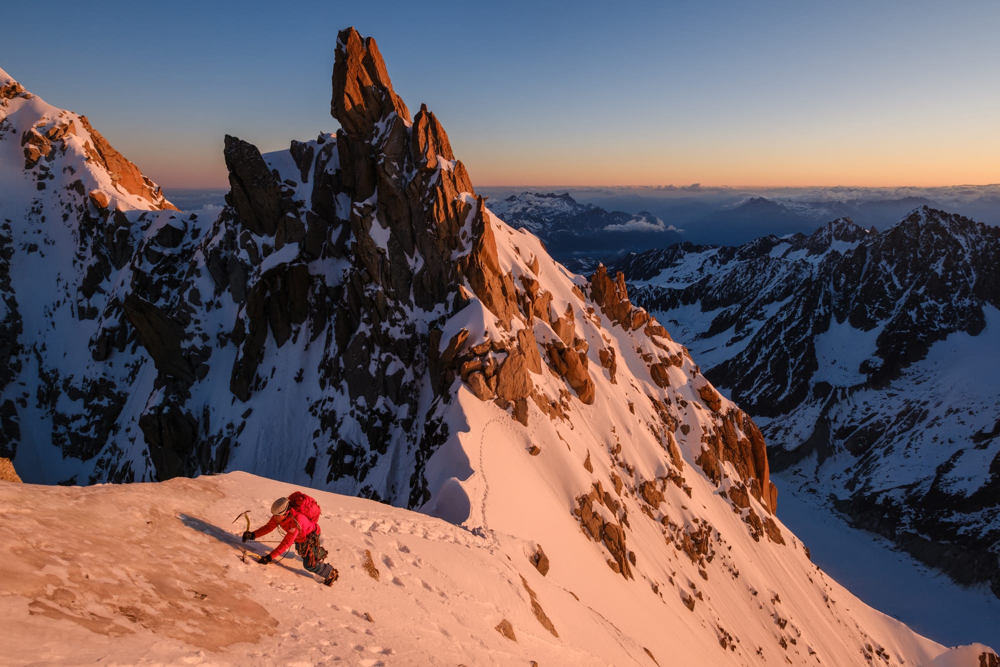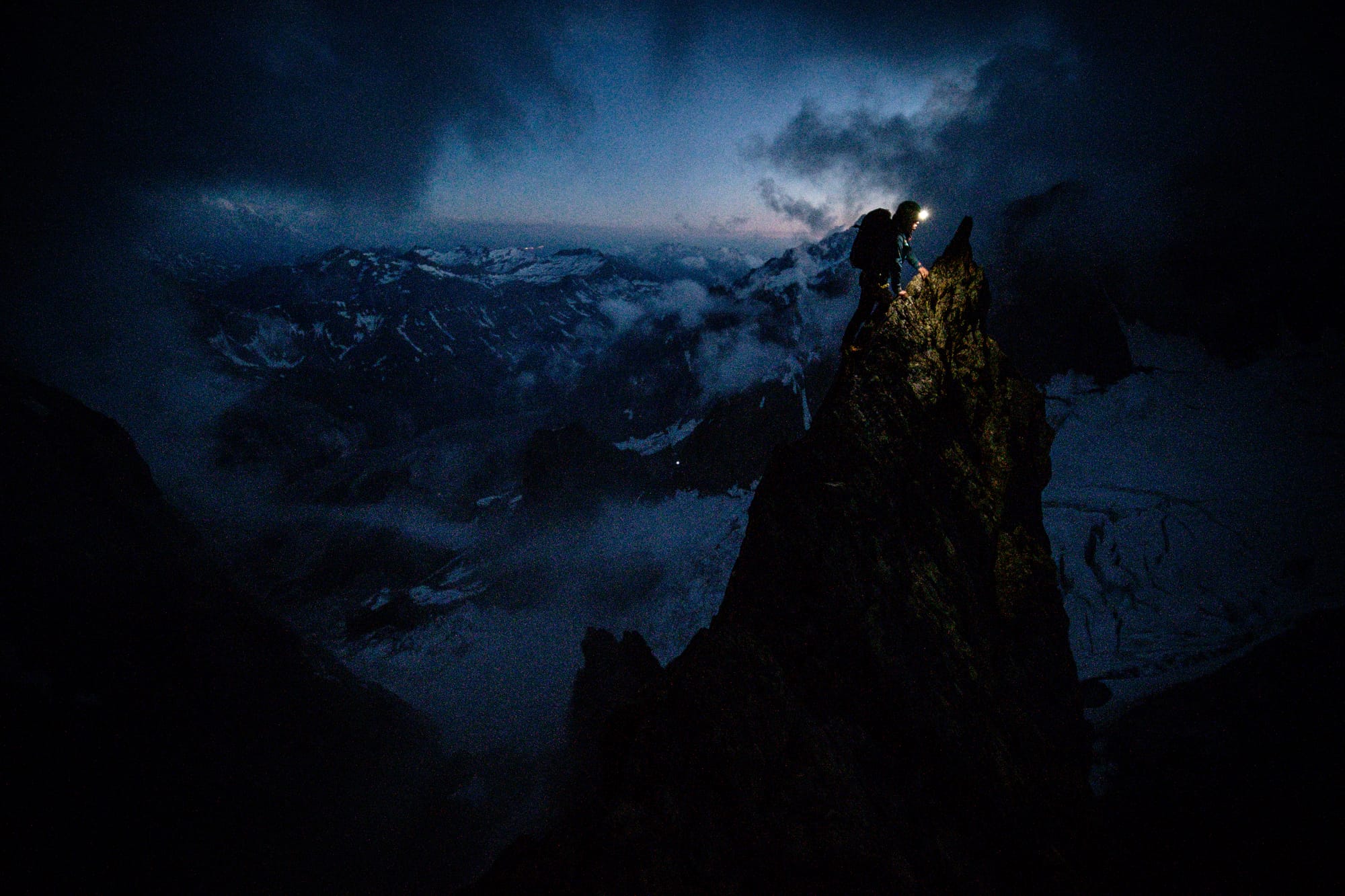 Aiguille du Jardin v květnu 2025. Na tenhle vršek jsem měl spadeno posledních 5 let a ne a ne vychytat bezpečnou podmínku. Nakonec nám to s Martinem vyšlo na výbornou, i když jsme museli zvolit netradiční start z Aiguille du Midi, neplánovaně bivakovat a protáhnout výstupový den na krásných 21 hodin. Fun fact? Aiguille du Jardin a sousední Grande Rocheuse, které byly tehdy nově zařazené na seznam, byly posledními vrcholy, kterými ve 30. letech 19. století doplnil svou sbírku první „sběratel“ čtyřtisícovek, Rakušan Karl Blodig. Ve svých 72 letech si to tehdy střihnul severkou sólo nahoru i dolů. Kéž bych měl za 30 let stejnou fyzičku a odhodlání!