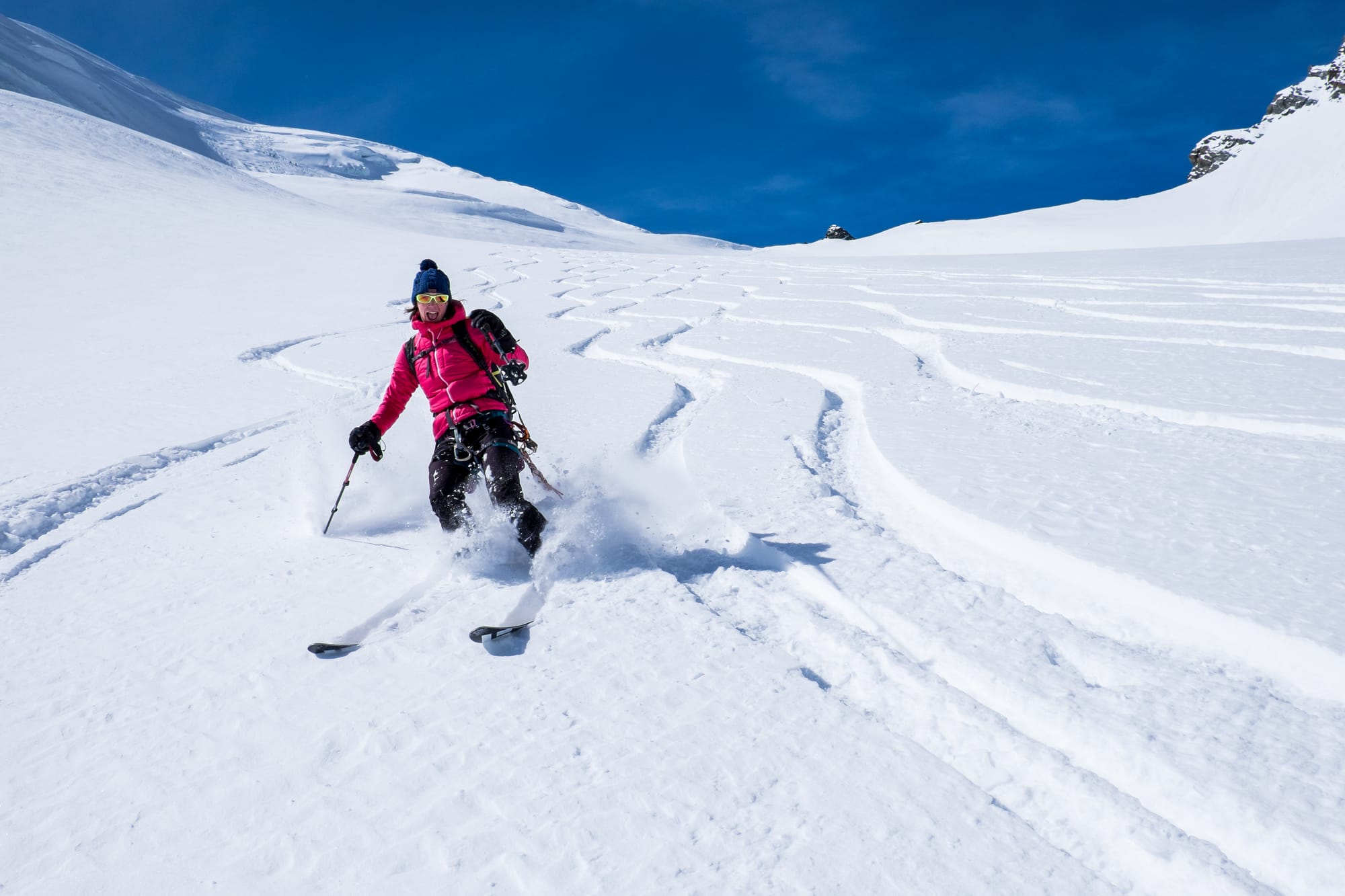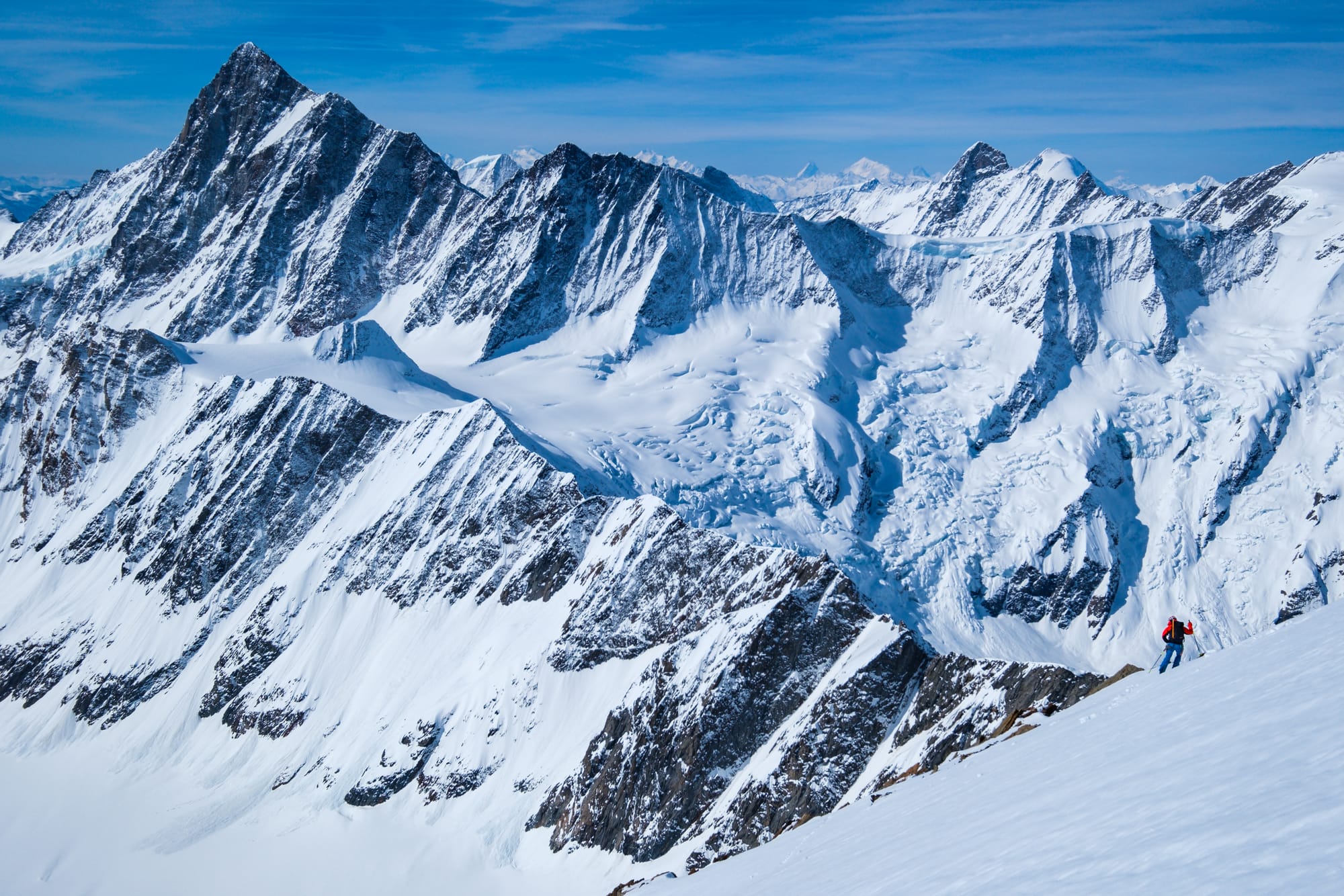 - Bernské Alpy: s výjimkou Schreckhornu jsou všechny tamější čtyřtisícovky na skialp jak dělané! Největšími lahůdkami jsou Aletschhorn, jižní stěna Lauteraarhornu a samozřejmě nejvyšší Finsteraarhorn. Místo na chatách rezervujte brzy, v jarní sezóně praskají ve švech.