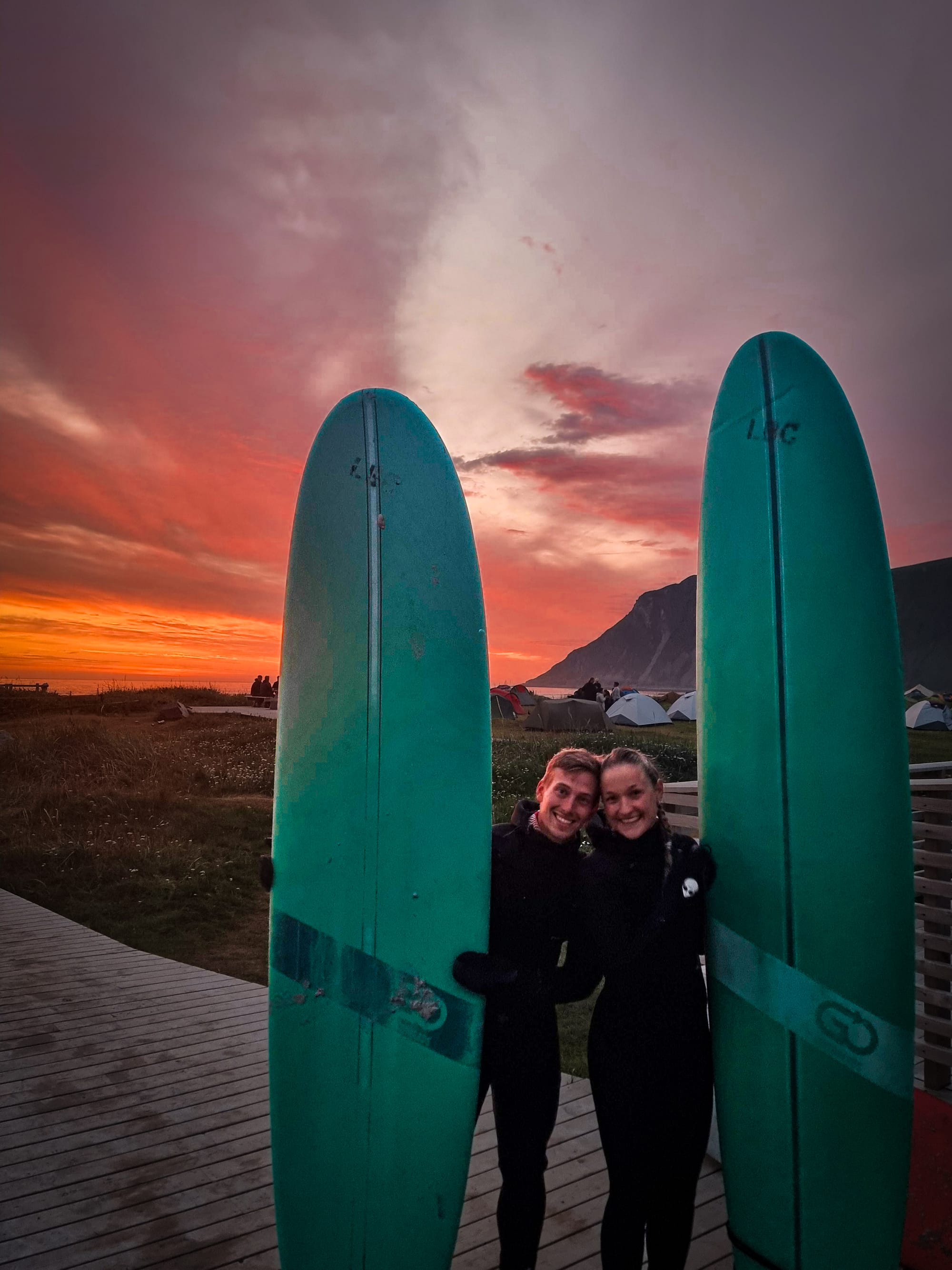 Ano, Lofoty jsou totiž nejsevernější místo na Zemi, kde se dá surfovat. Jsou tu dvě nejznámější surfové pláže – Unstad Beach a Flakstad Beach (což byla vlastně „naše“ pláž u kempu). Surfování není úplně naše silná stránka. Ale stát poprvé na surfu za polárním kruhem, ve dvě ráno, kdy je obloha růžová jako při západu slunce… To je zážitek, který se slovy těžko popisuje.