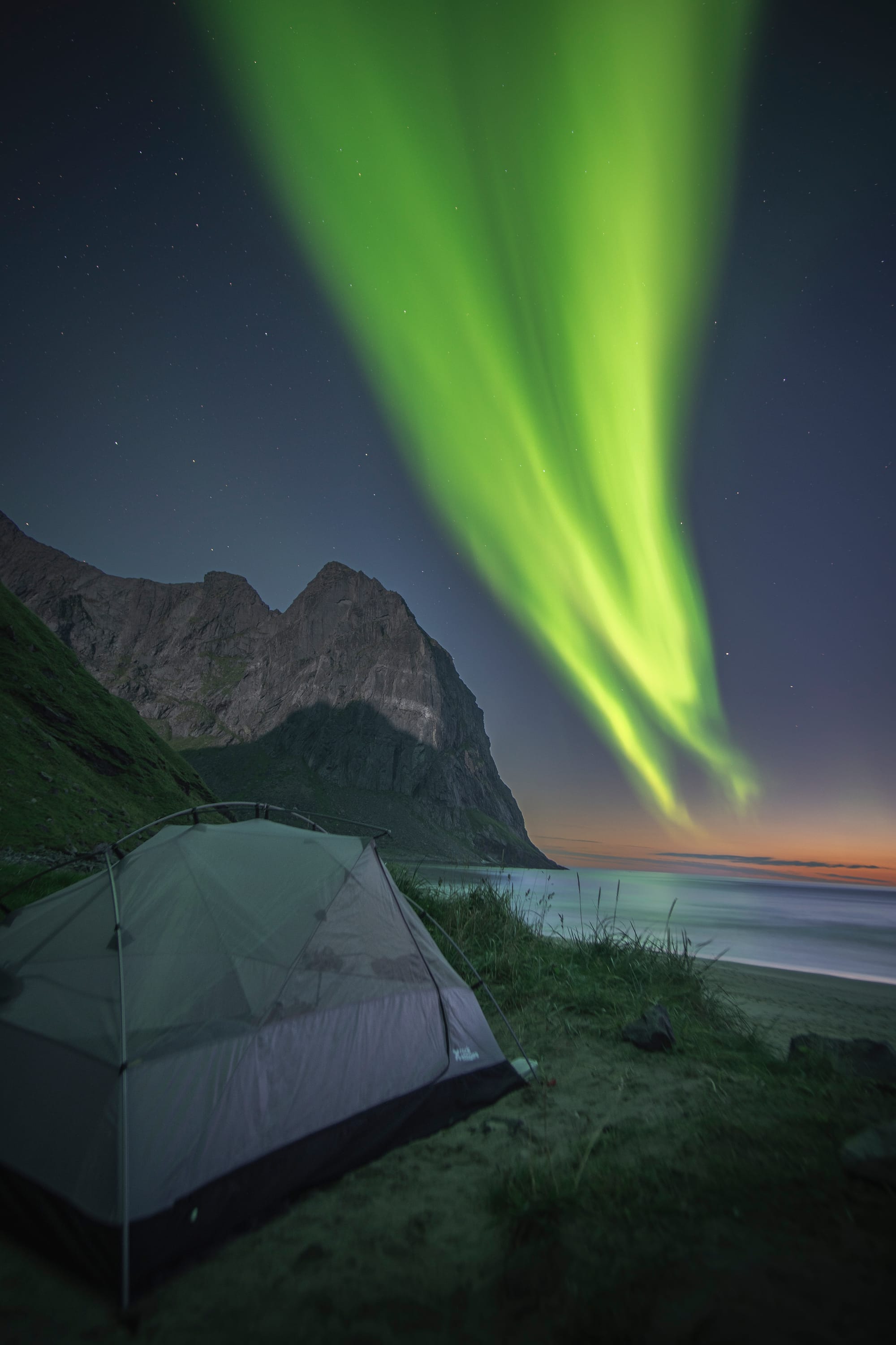 Na pláži jsme byli skoro sami – jen se dvěma dalšími dvojicemi. Ale díky velikosti pláže jsme o nich skoro ani nevěděli. Večer jsme si dali rychlou, velmi osvěžující koupačku v oceánu, večeři a pivečko při zapadajícím slunci a chtěla bych napsat, že jsme se krásně vyspali… Ale nevyspali. Téměř celou noc byla vidět silná polární záře, takže jsme místo spánku seděli venku, pozorovali tančící barevnou oblohu a fotili. Pro mě to byl jeden z nejsilnějších zážitků na Lofotech.