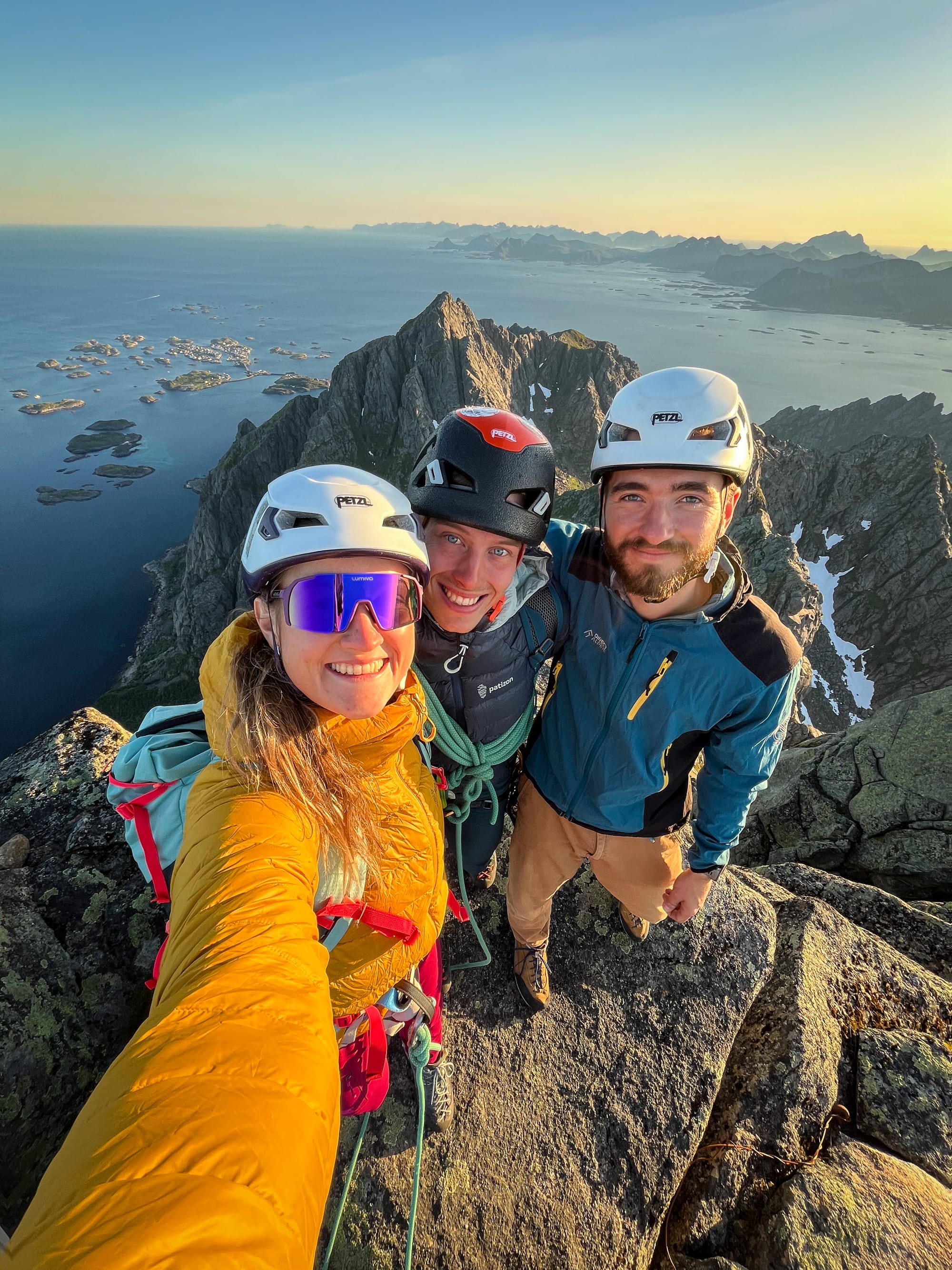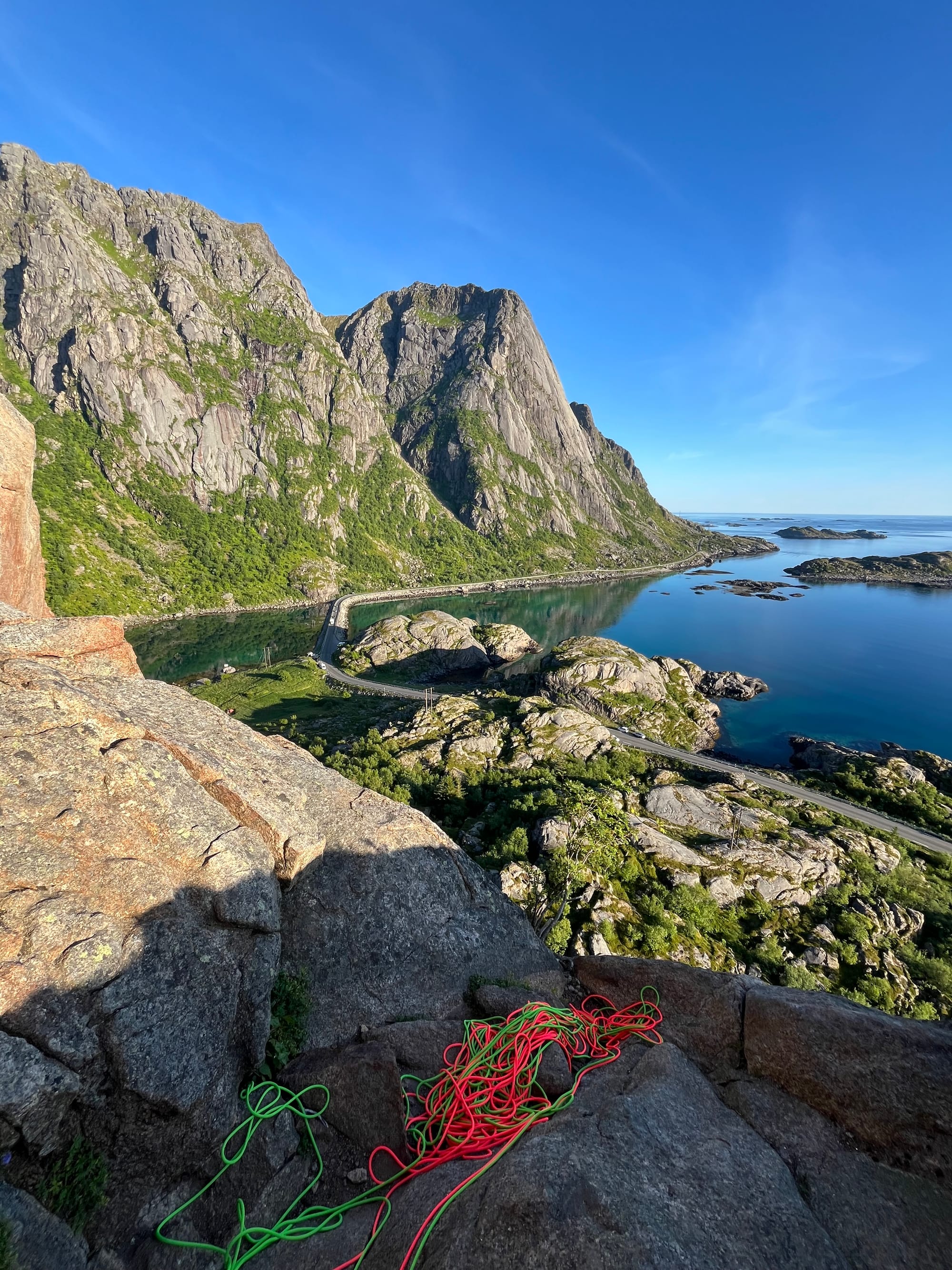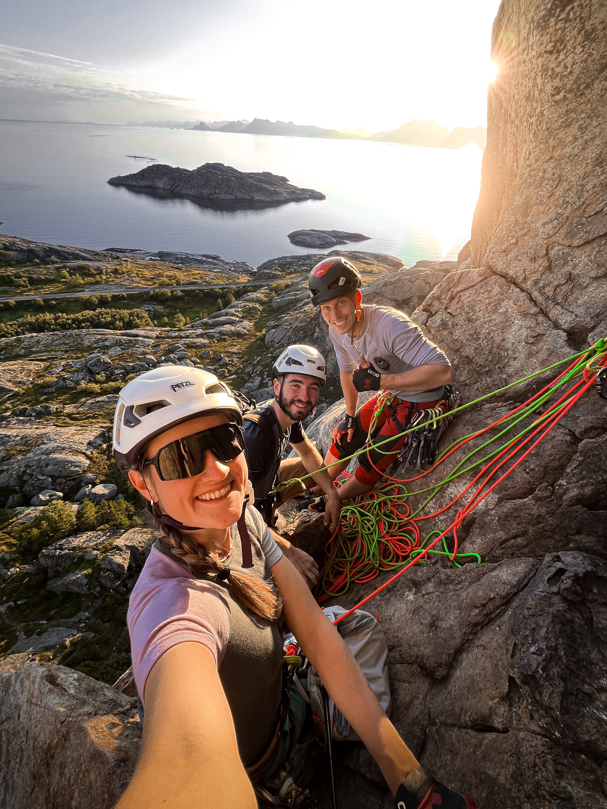 Po celých Lofotech jsou totiž nádherné žulové stěny a kopce, na které vedou nezajištěné cesty, prostě tradiční lezení. Takže pokud jsi sportovní lezec zvyklý na zajištěné jedno- nebo vícedélky v Arcu, budeš potřebovat trochu tréninku… A hlavně hodně velký morál. Stejně jako jsme potřebovali my. Pro nás to byl ze začátku takový love-hate relationship. První vícedélky byly docela intenzivní – a to jsme si vybírali ty nejlehčí, co na Lofotech jsou. Naše první spárové lezení. Pouze vlastní jištění. A často i vlastní štandy.
