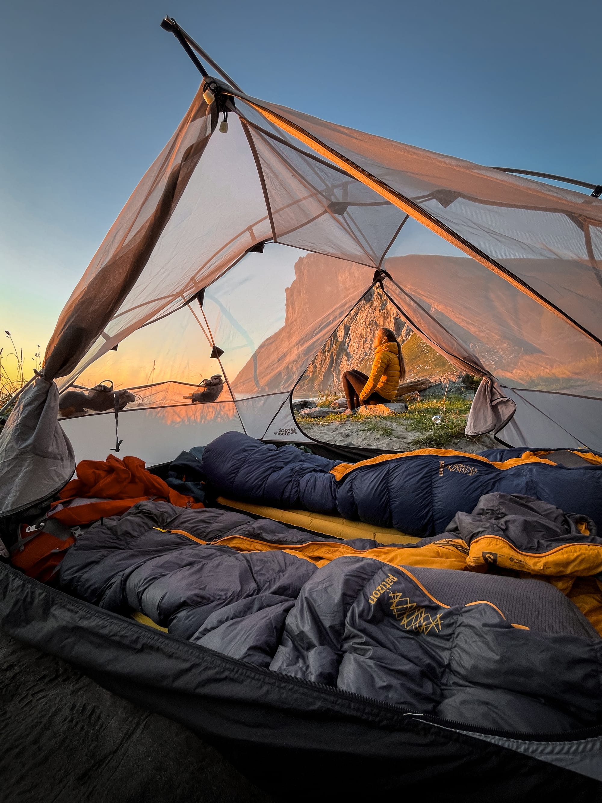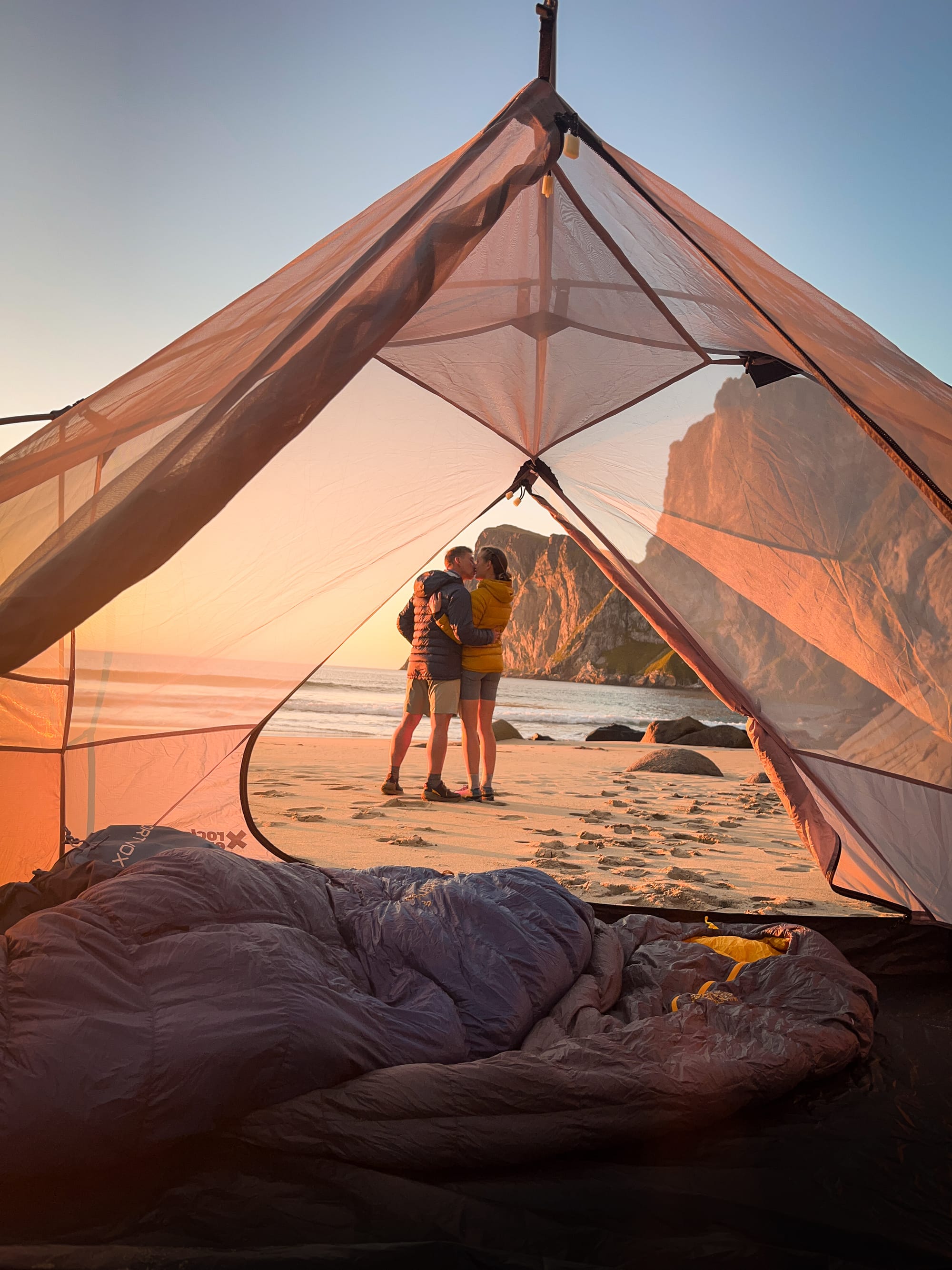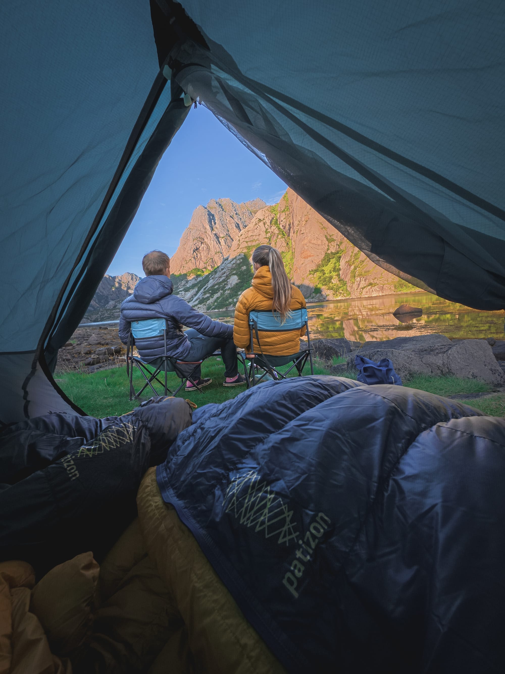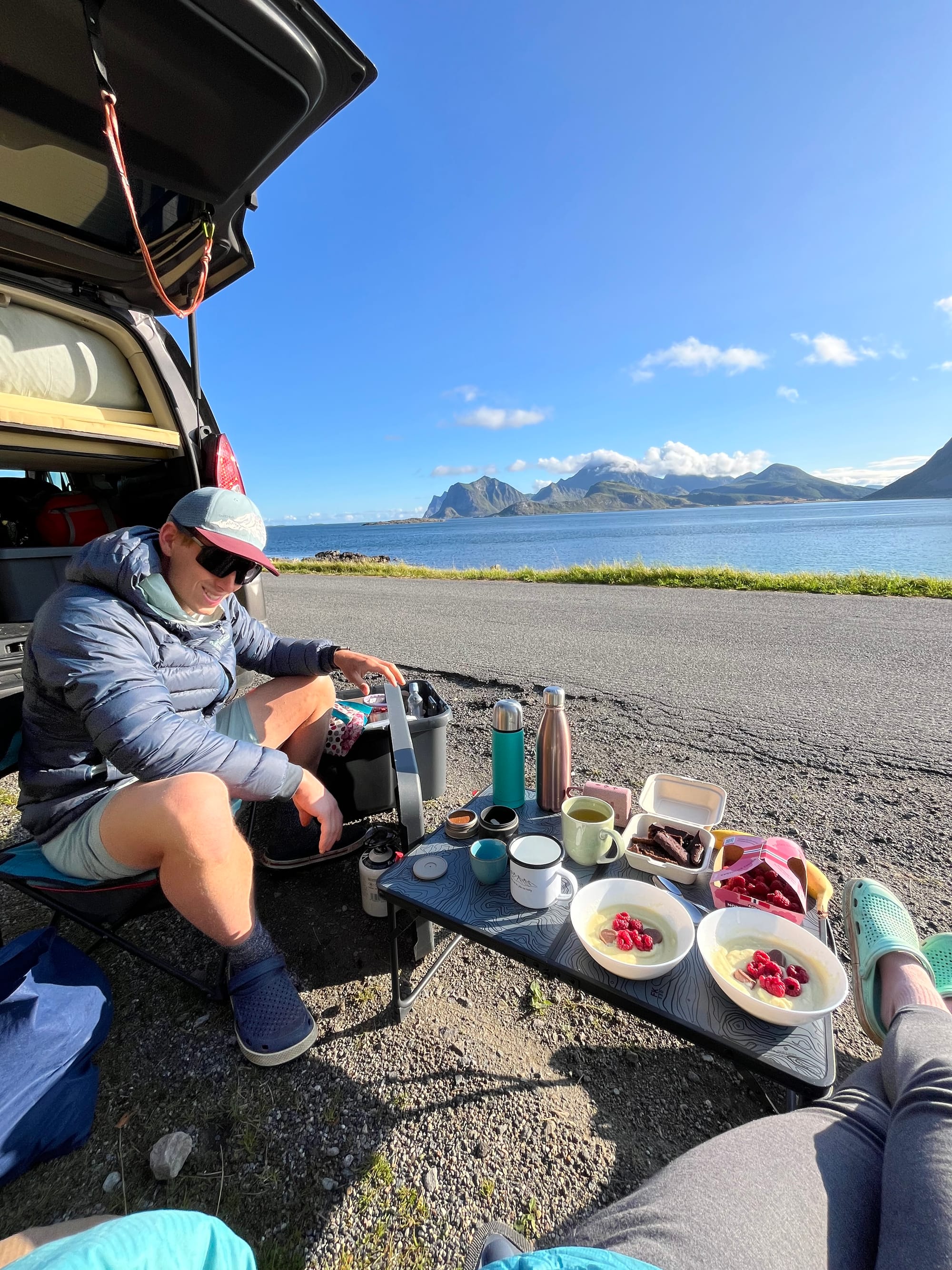 Další věc, kterou jsme si na Lofotech zamilovali, bylo kempování. Ať už v autě, nebo pod stanem. Spaní v autě je tady totiž povolené všude, mimo soukromé pozemky. Často tak najdete perfektní plácek přímo u cesty, kde bezstarostně zaparkujete, přespíte a ráno si dáte kafe s výhledem na fjord. Kempování má v polárním létě jen jeden problém: celou noc je světlo. Takže pokud plánujete spaní pod širákem, počítejte s tím, že se vám asi nebude spát úplně nejpohodlněji. Škraboška na oči ale dost vyřeší.