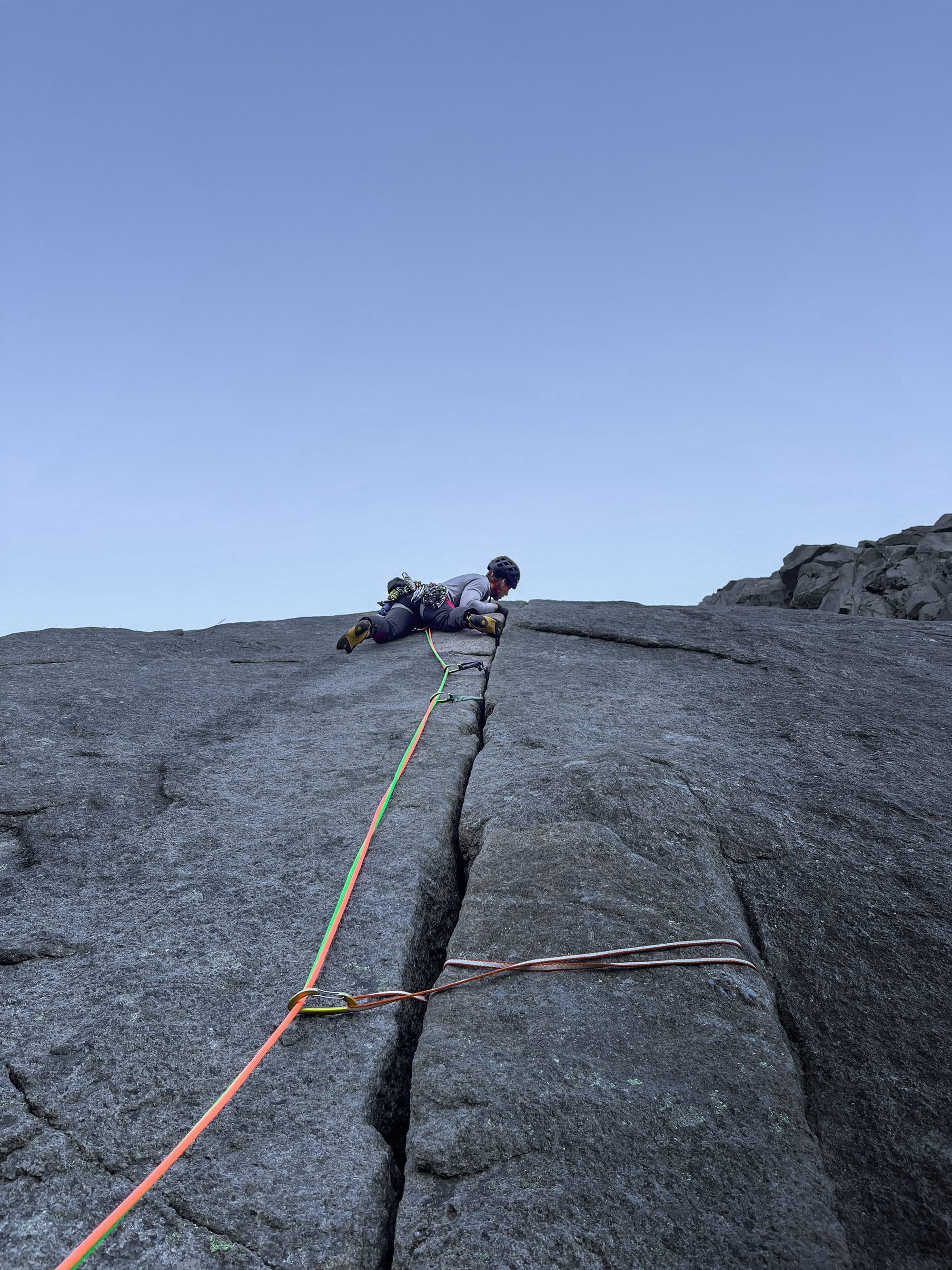 Upřímně – ani jeden z nás pořádně nevěděl, jak ty spáry lézt, aby to nebyla taková dřina. Ale postupně, s každým dalším vylezeným metrem, jsme si to zamilovali. A teď už se nemůžeme dočkat, až se na tuhle dokonalou žulu vrátíme. Snad to bude letos. Doufám, že už polezeme větší „prásky“.