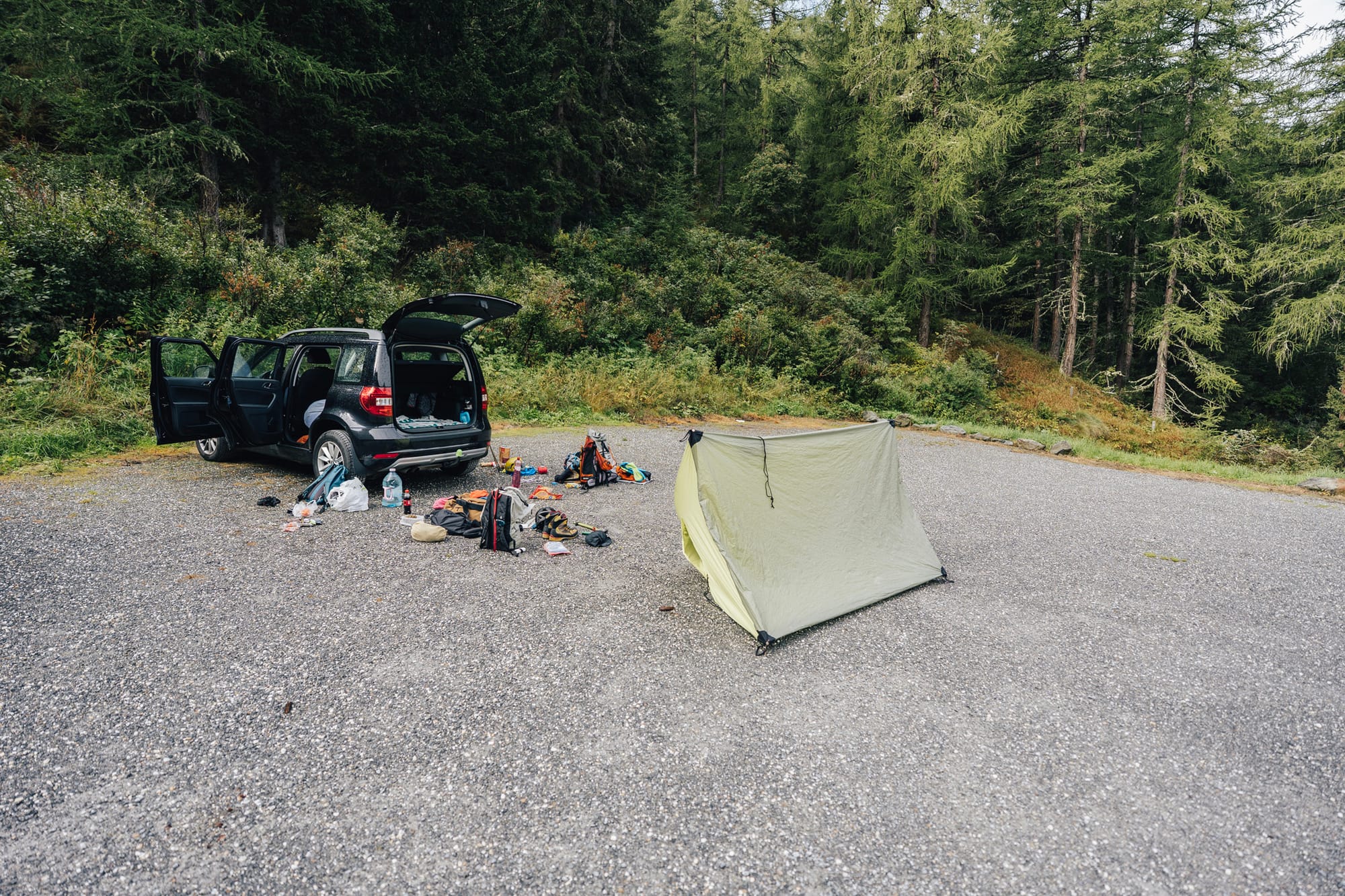 No a my jsme měli konkrétně jenom prodloužený víkend a stejně jsme osedlali škodovku a po bratru mírných 11 hodinách uléhali do stanu vedle auta - na parkovišti na začátku údolí Valsorey. Což je vlastně zvláštní. Ve Švýcarsku nebývá zvykem, že by bylo v pohodě si ustlat jen tak na divoko. Tady to bylo v pohodě a Patizon G 400 mě hřál hezky až do rána...
