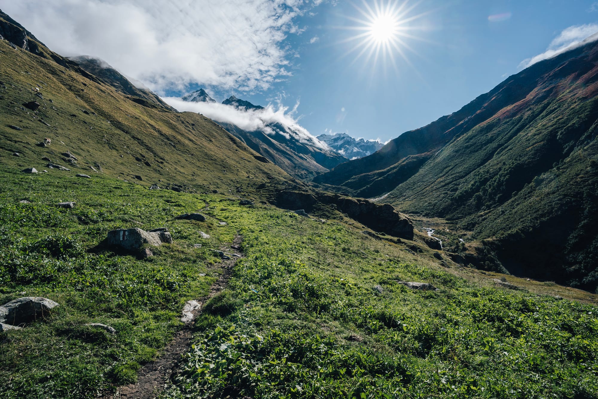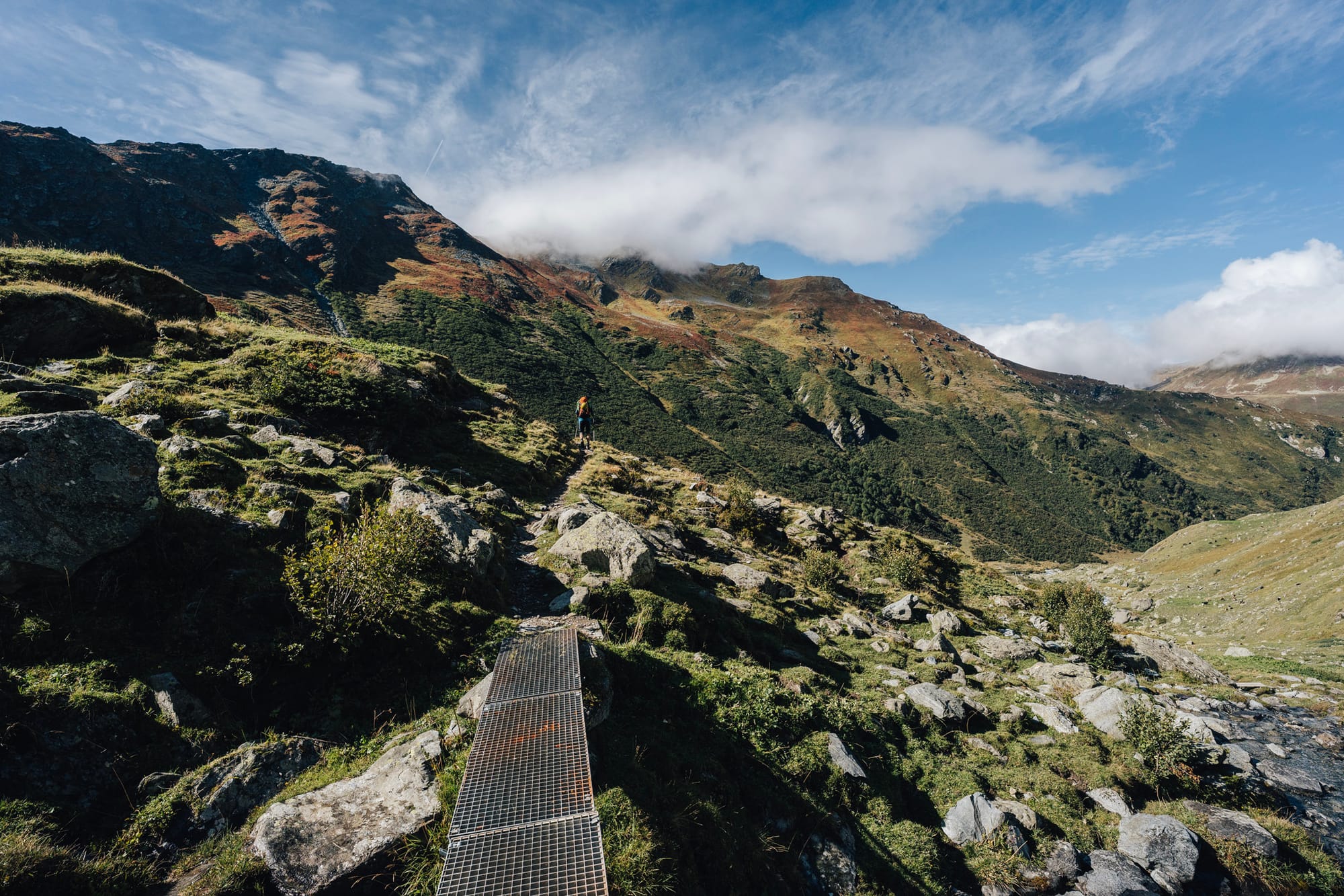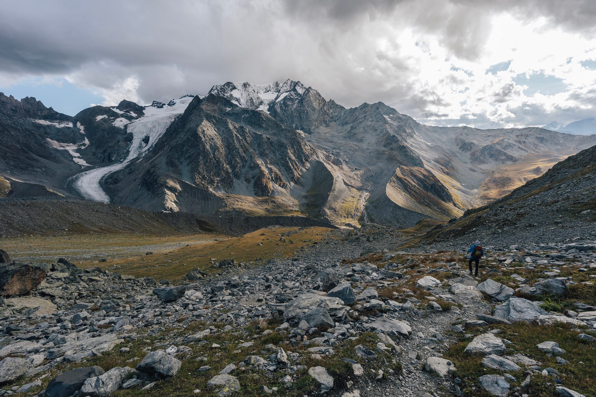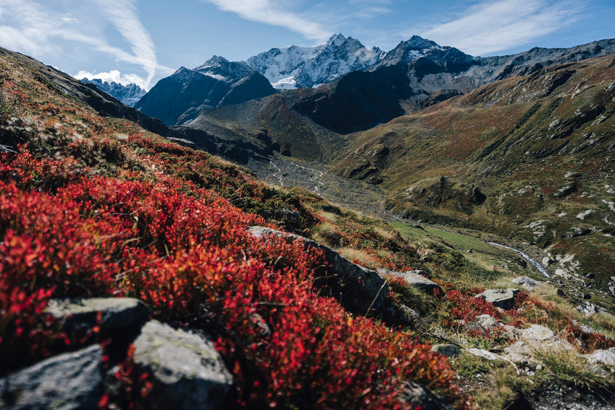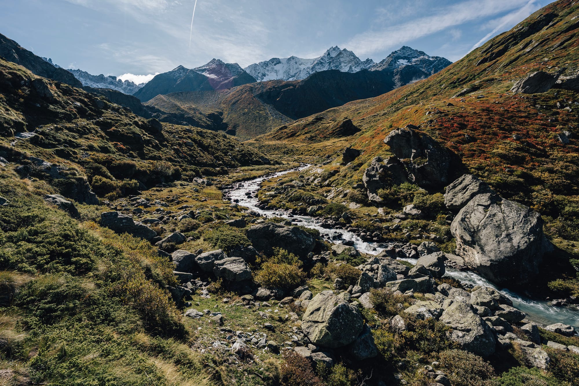 Na druhou stranu to zase celé vede opravdu krásným údolím. Podél načechrané a divoké říčky vytékající z ledovce Valsorey člověk stoupá nejdřív mírně, skrz pastviny s krávami, aby pak u posledních salaší nabral výšku a začal si o kus víc užívat rozhledy na protější stranu. A tu jsme my měli celou krásně vybarvenou do oranžových, žlutých a červených tónů podzimního podrostu. Vlastně dost fotogenický a dobrý.