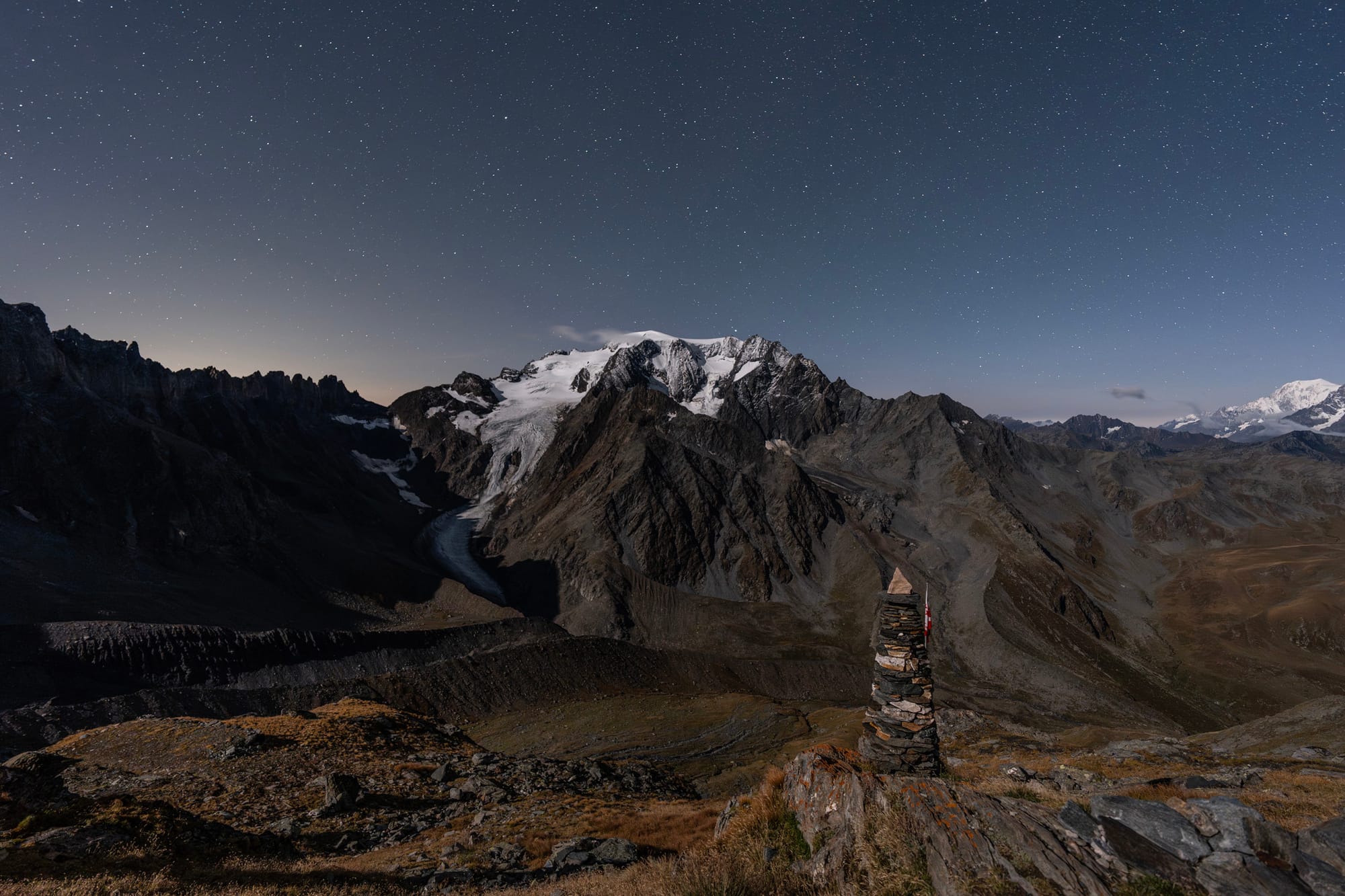 Důsledkem toho samozřejmě je, že cestou na chatu kromě krav a kamzíků potkáš už jenom pár podobně divných individuí jako jsi ty. Takže to v praxi půjdeš o samotě a ty výhledy na majestátní Mont Vélan budš mít v klídečku bez davů. Aspoň tak jsme to měli my - a podle knihy túr na chatě to tak bývá téměř celý rok.