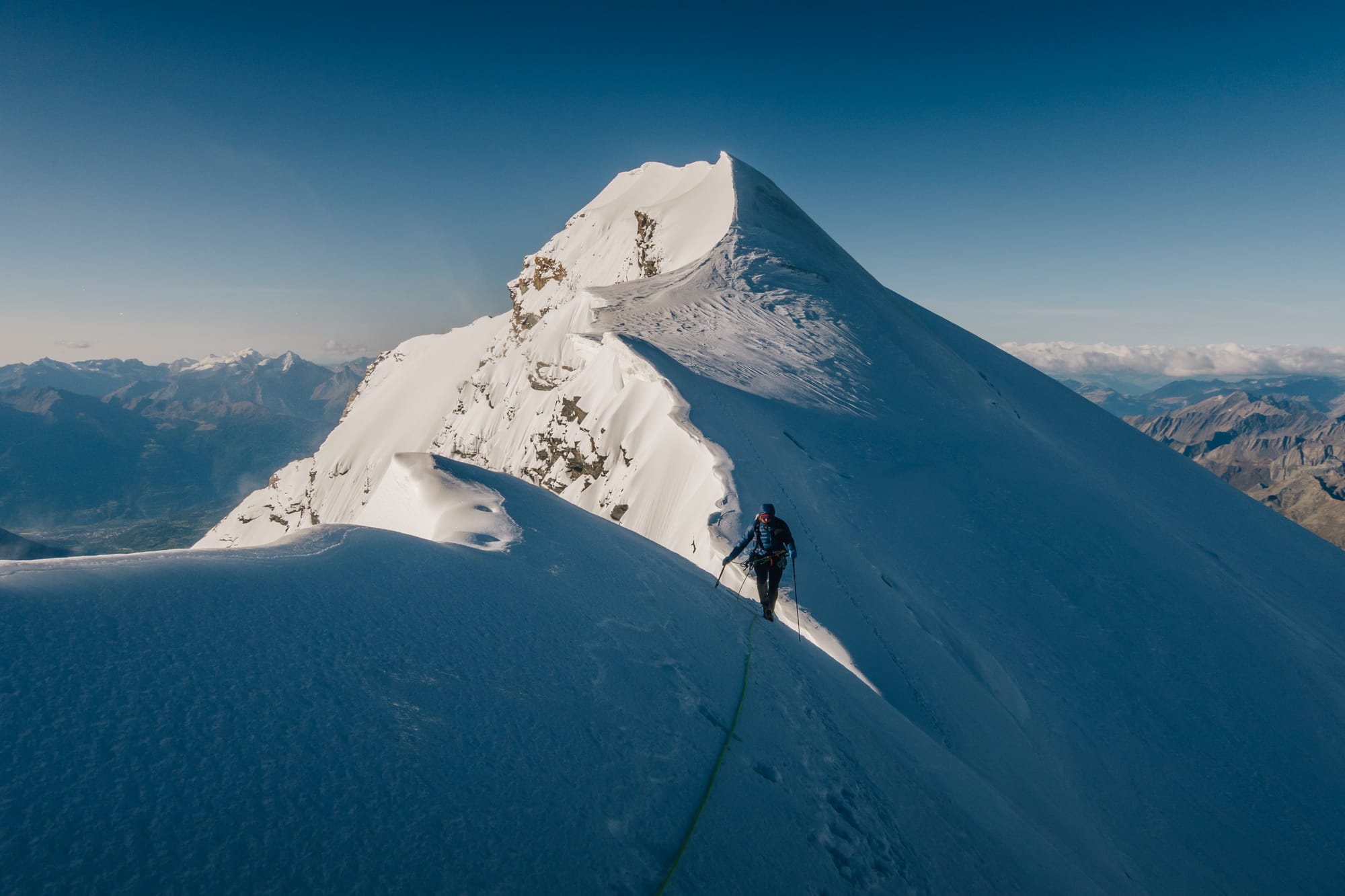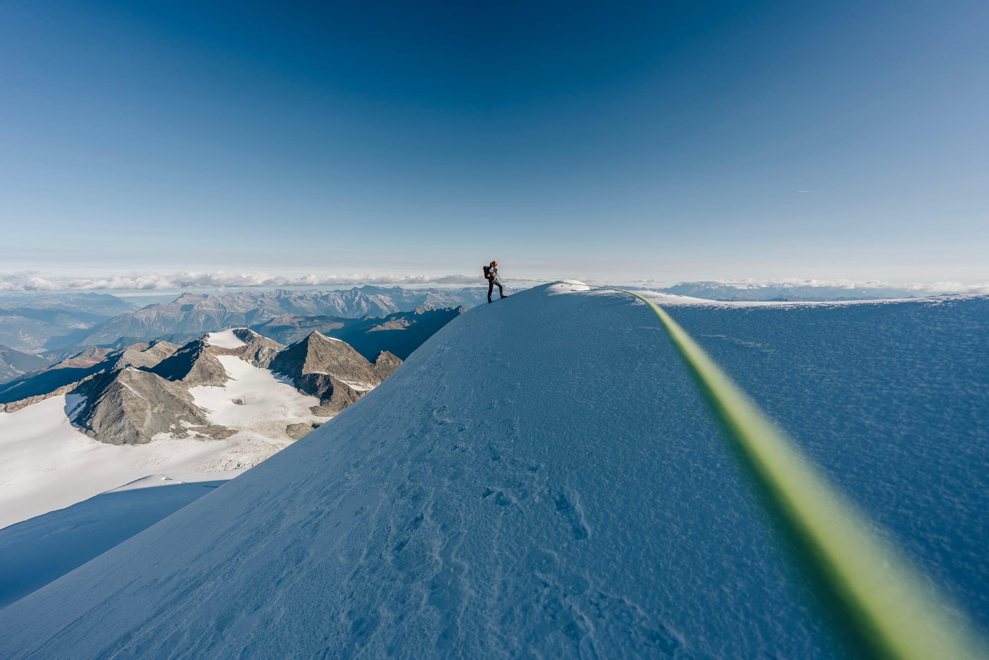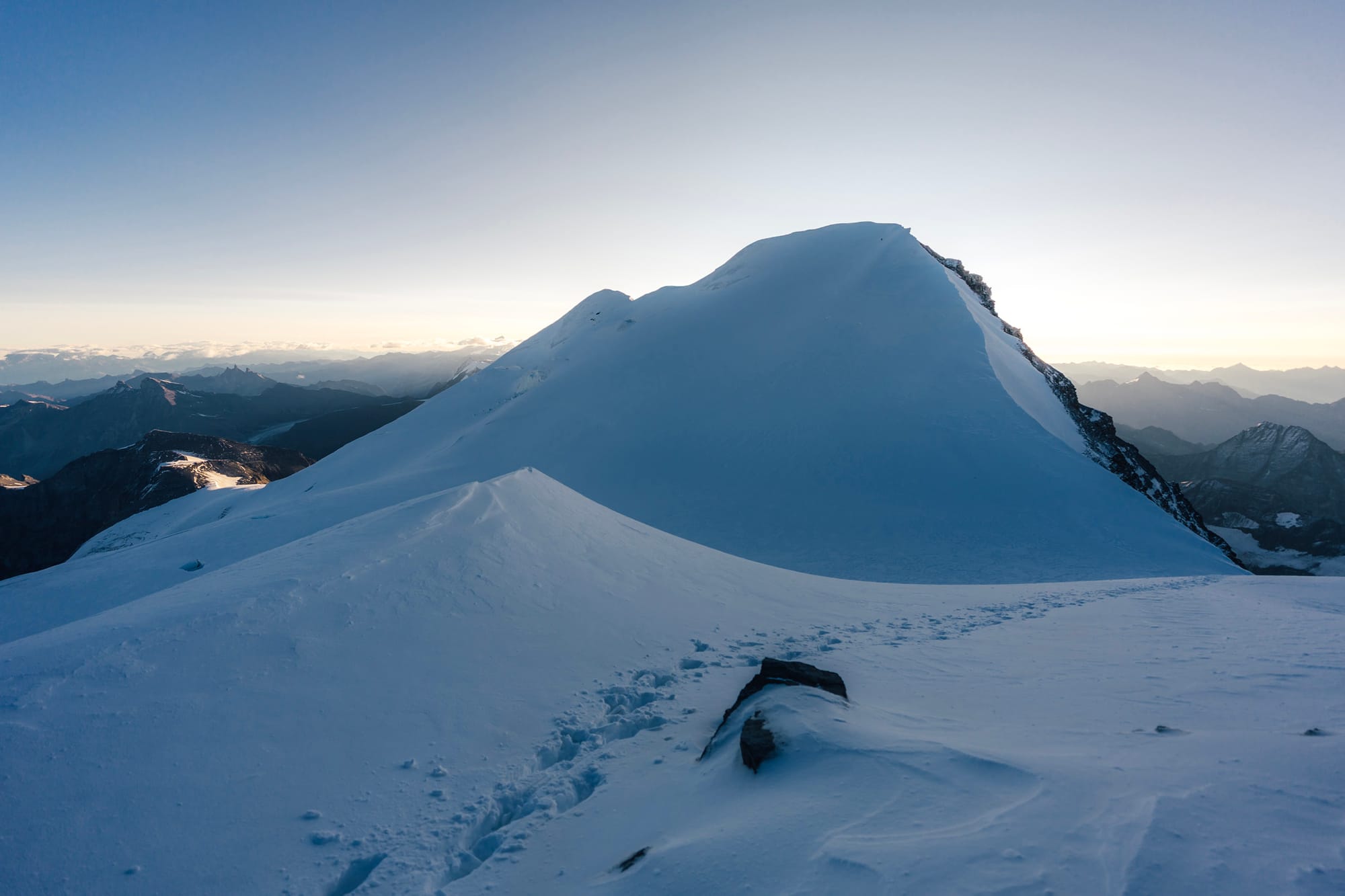Z první čtyřky na druhou to není nic strašnýho. Alpinista se oklepe z toho šrotu, kterým se sem dostal a přepne se do módu "po sněhu se na ten další brdek už nějak dooslíme.." A taky že jo. Pár metrů sestup, pak zase nahoru a najednou se jeden vyskytne na oblém vršku s názvem a kótou - Grand Combin de Grafeneire (4 314 m). To je hlavní vrchol a mohlo by se zdát, že tady žádnej háček nebude. Ale prd. Ještě je tu třetí oficiální čtyřtisícovka.