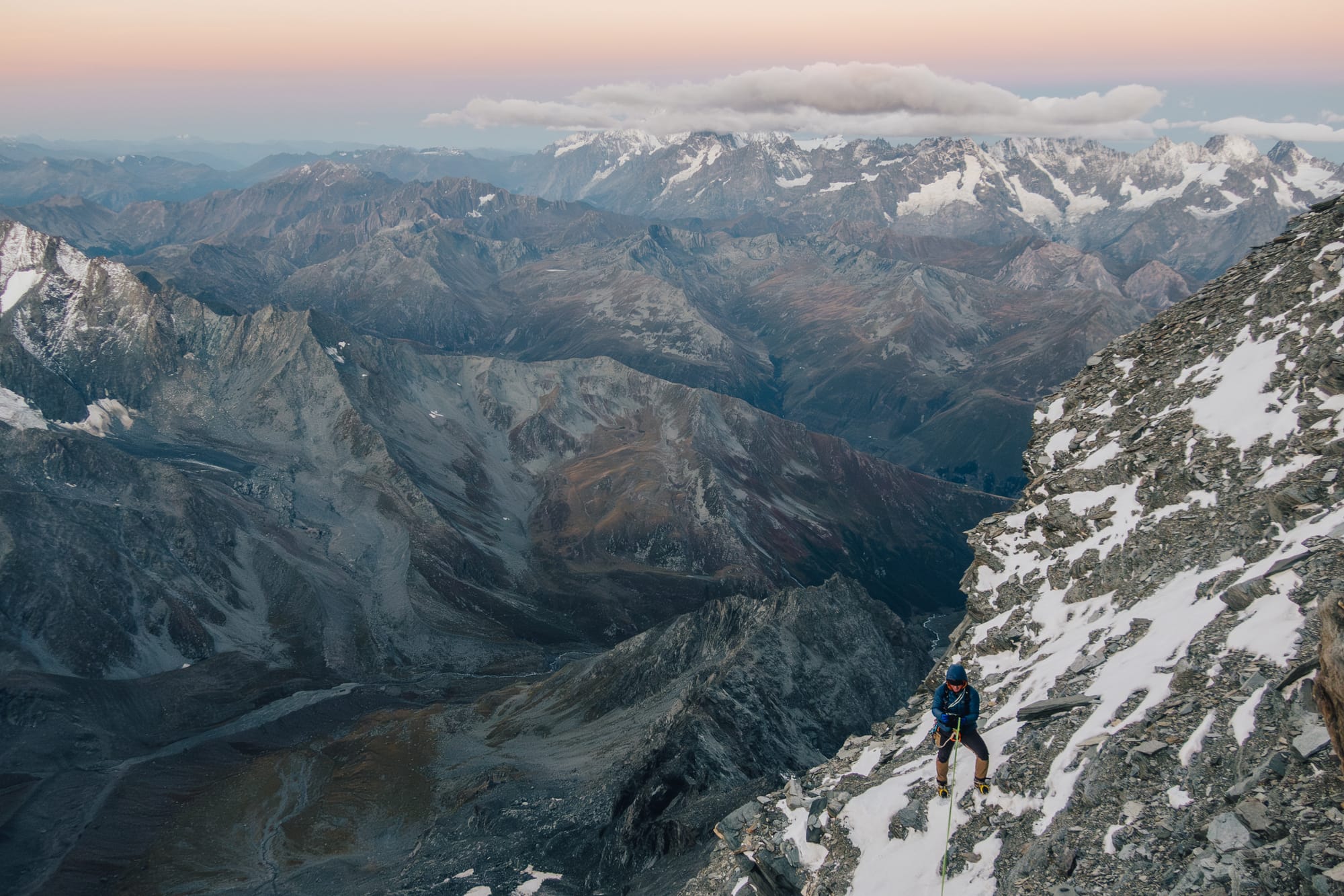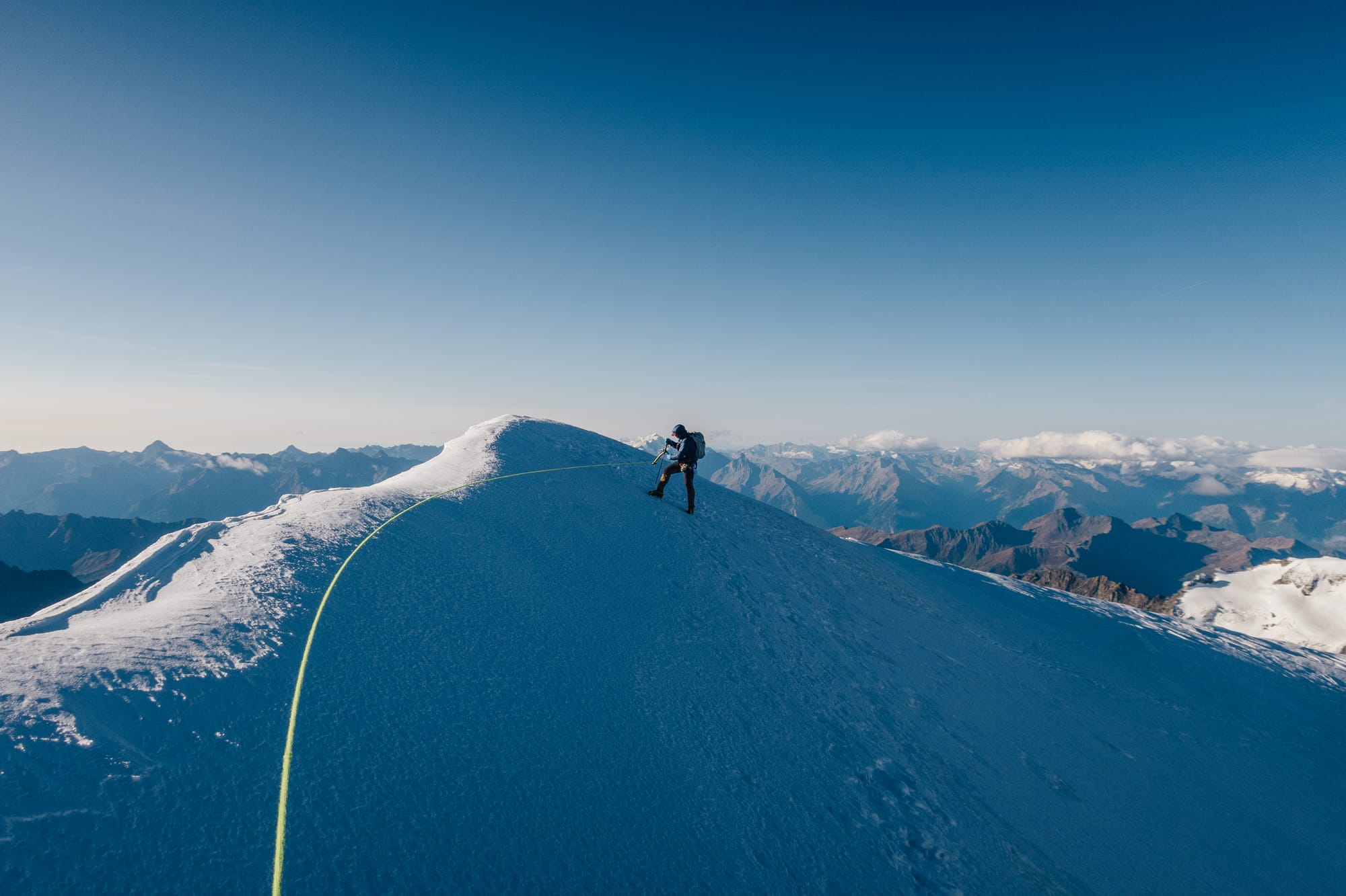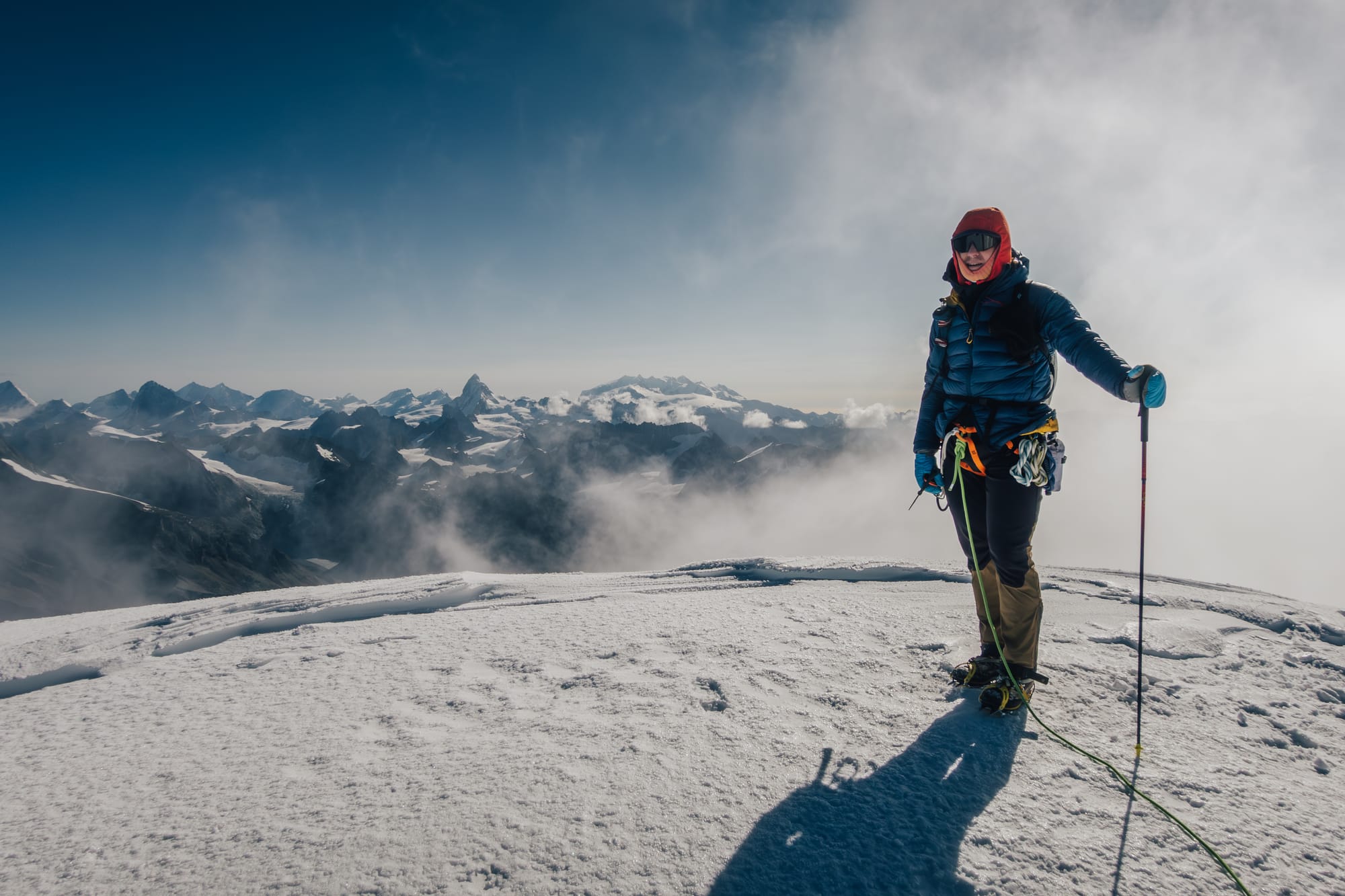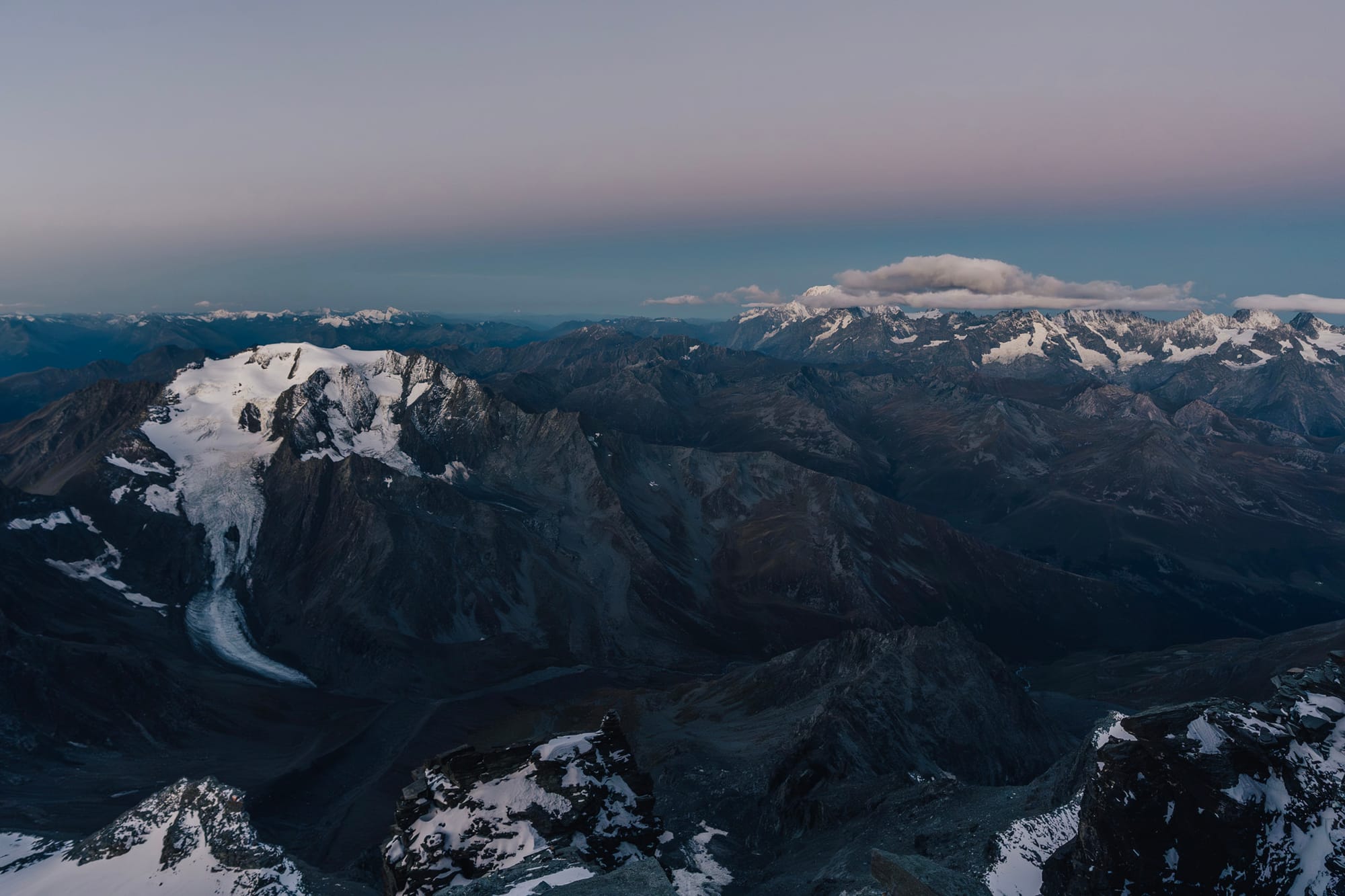 Z první čtyřky na druhou to není nic strašnýho. Alpinista se oklepe z toho šrotu, kterým se sem dostal a přepne se do módu "po sněhu se na ten další brdek už nějak dooslíme.." A taky že jo. Pár metrů sestup, pak zase nahoru a najednou se jeden vyskytne na oblém vršku s názvem a kótou - Grand Combin de Grafeneire (4 314 m). To je hlavní vrchol a mohlo by se zdát, že tady žádnej háček nebude. Ale prd. Ještě je tu třetí oficiální čtyřtisícovka.