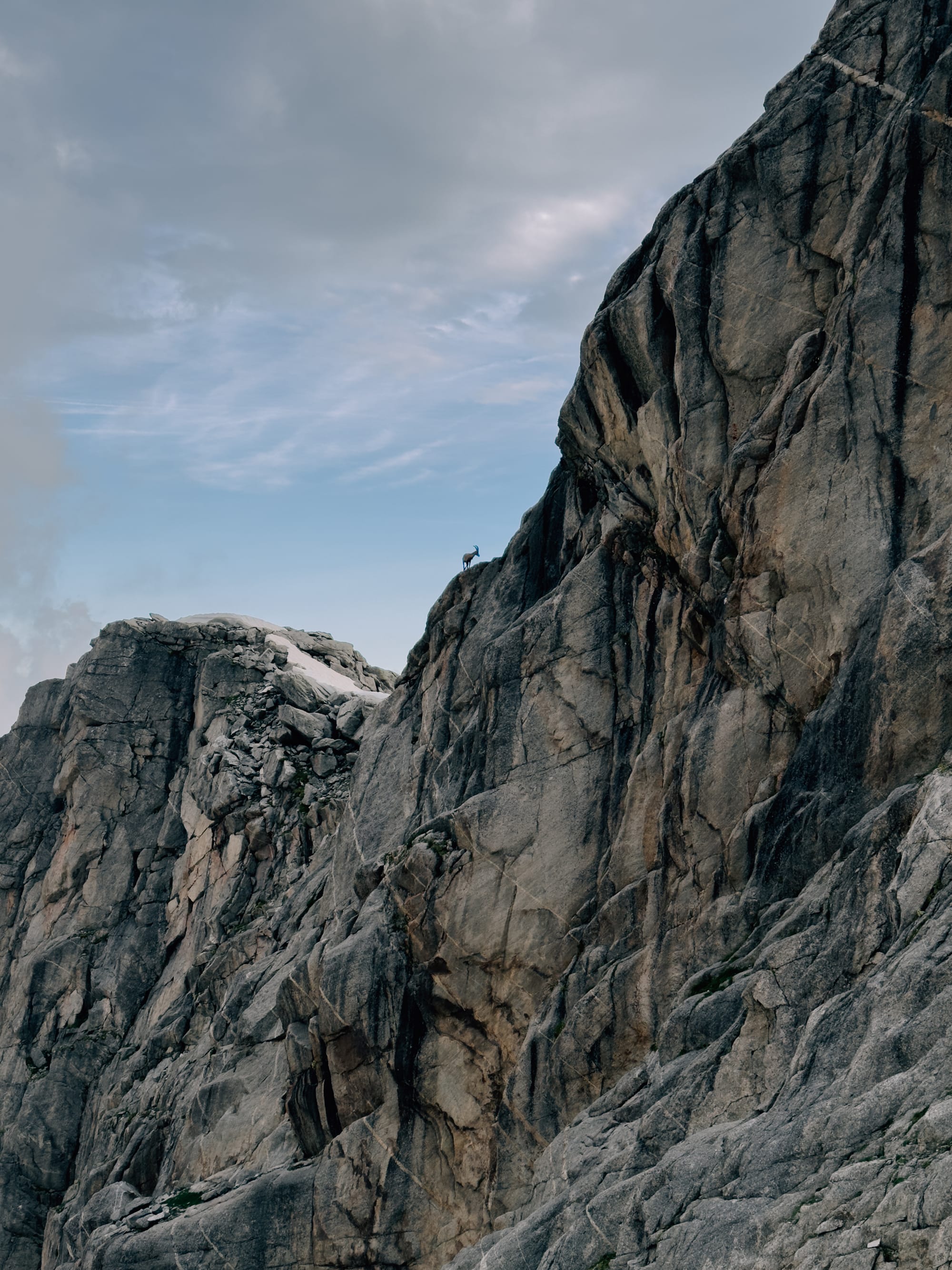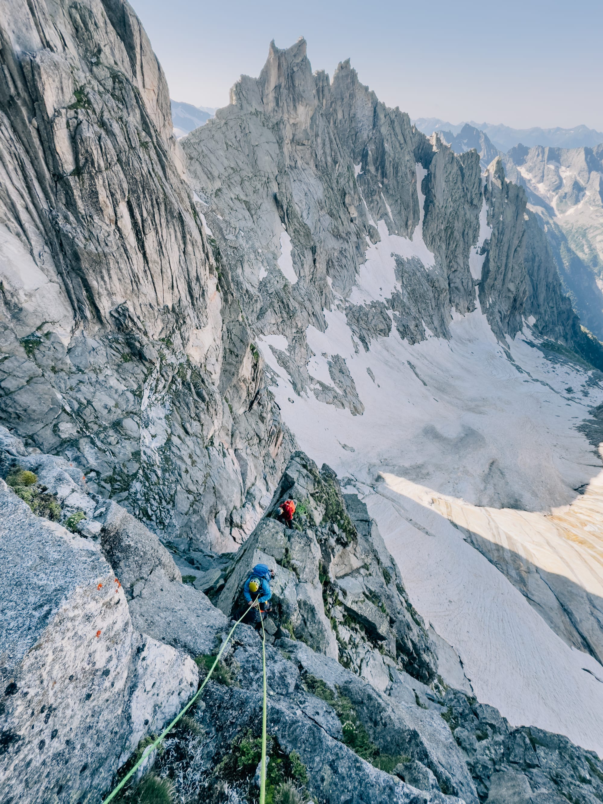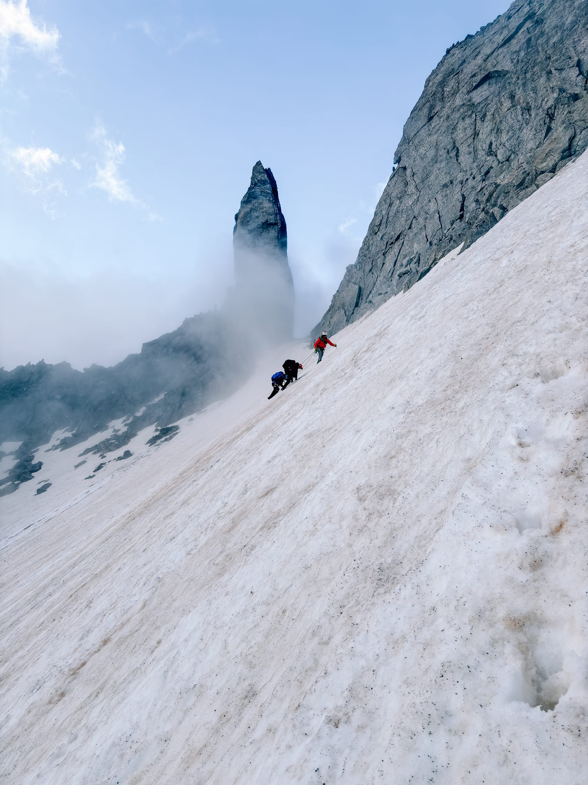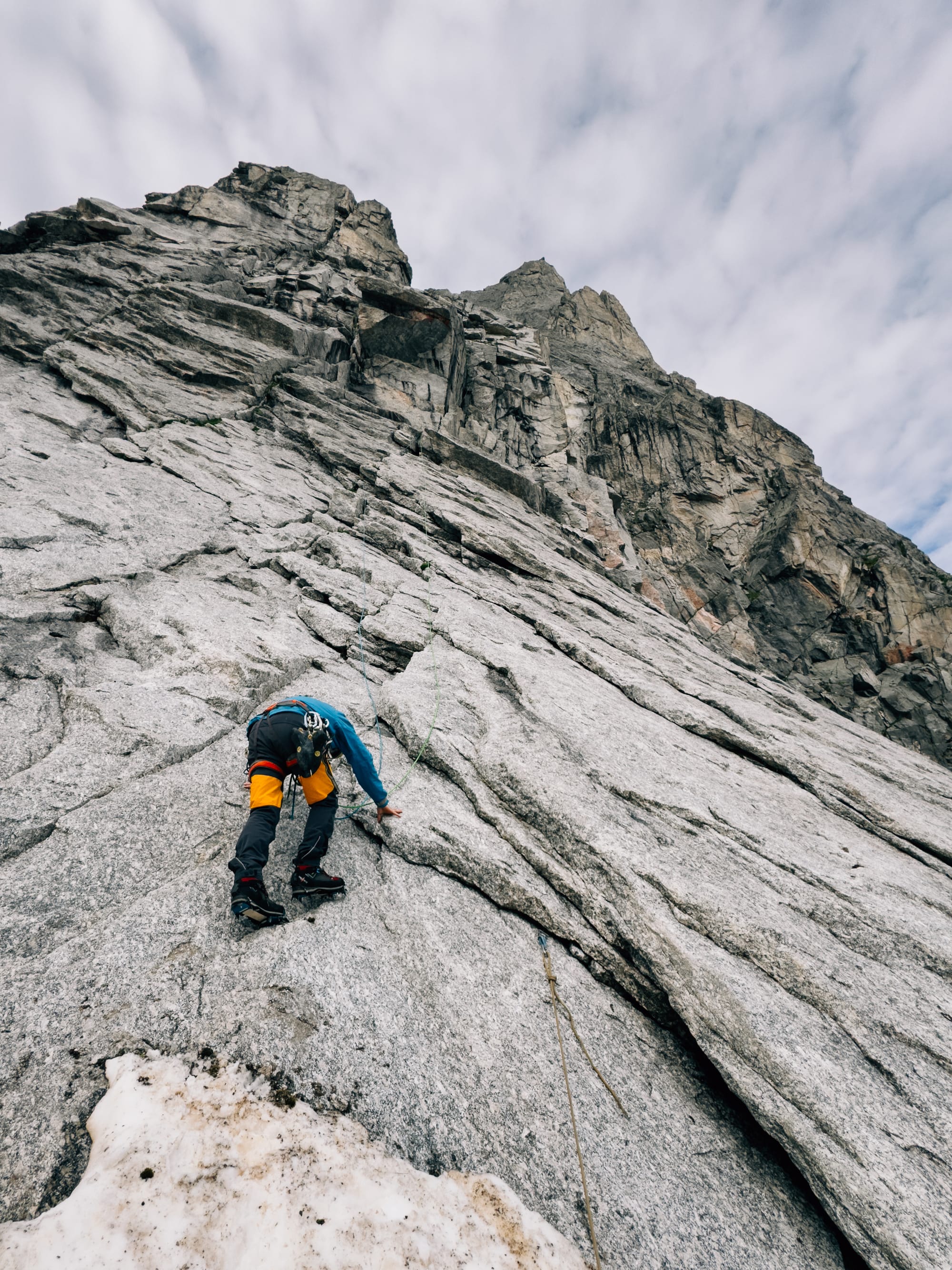 Druhý den budíček ve 4:30, lezeme klíčové tři délky skalní galerií, nejspíš prvovýstup, a pak lehčím terénem, sněhovým polem a šrotem k věži.