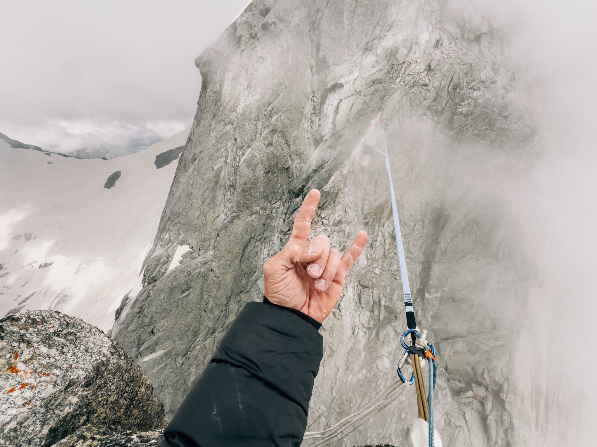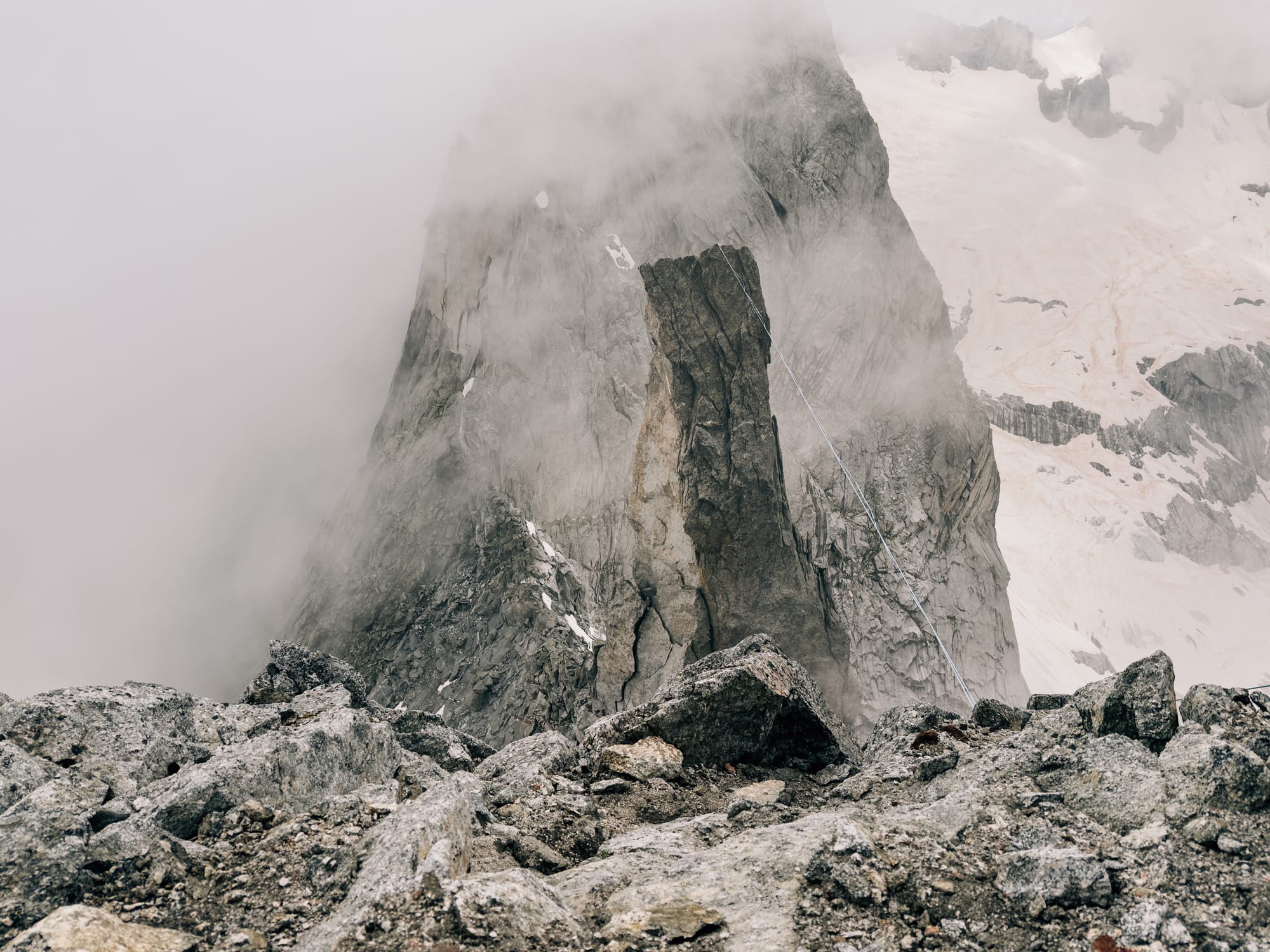 Odpoledne vrtáme jednu stranu kotvení a natahujeme. Pak s Lukym lezeme hezké dvě délky na obelisk a do toho se pomalu začnou honit mraky a zvedat vítr. Když je lajna natažená, tak už jsme v mraku kompletně a momenty hezkého počasí se začínají zkracovat, až úplně mizí. Asi dvě hodiny trávíme čekáním na milosrdné okénko v mracích, které by umožnilo lajnu přejít. V mlze mrzneme a kontrolujeme počasí, zda-li z toho nebude bouřka.