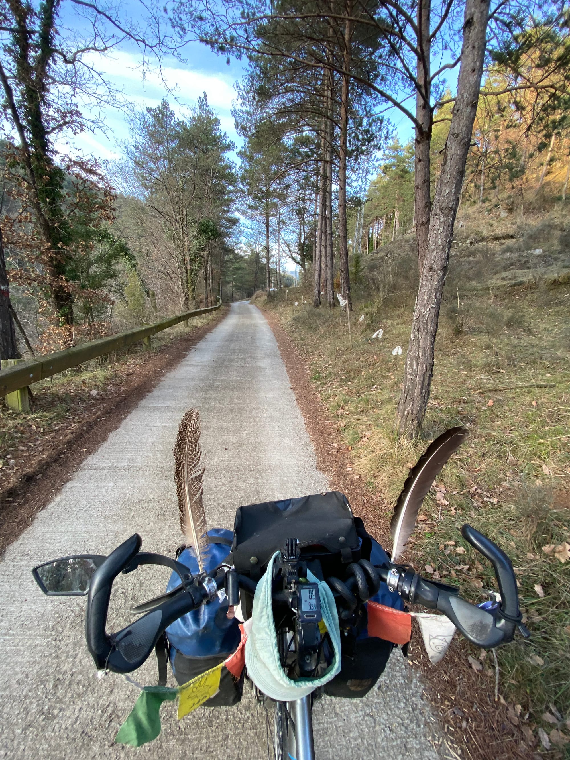 Pátek 2. ledna: Ujeli jsme 26 km a nastoupali 747 m. Kačenka si všimla bubliny na gumě u vozíčku a že prý bych ji měl vyměnit. Ale já jsem byl línej a věřil jsem, že vydrží až do města. Ale stejně jsem radši jel z kopce opatrně, což bylo rozumné – po pár kilometrech jsem zaslechl divný zvuk – guma na vozíčku byla prázdná. Naštěstí jsem měl náhradní, takže kolo dolů, vyndat duši, zalepit a pak napumpovat svalstvo, neboť nandat zbrusu novou pneumatiku je vždycky námaha. No a pak už bez nehody krásným sešupem až dolů do města Ripoll.