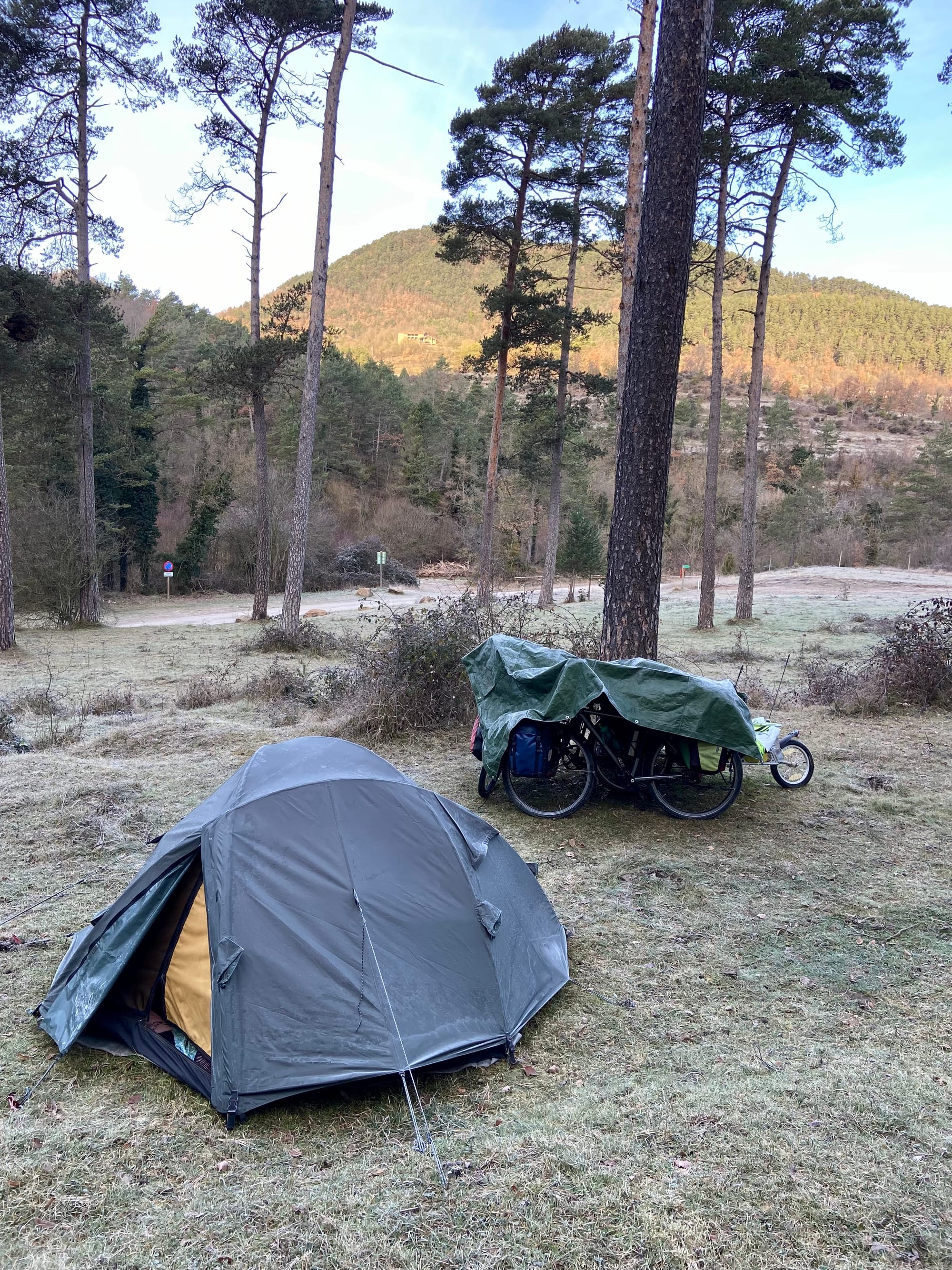 Čtvrtek 1. ledna: Tenhle den byl velmi krátký – ujeli jsme celých 10 km – to zní jako vtip, ale byly to dost náročný kilometry. Hlavním důvodem byl ale pozdní odjezd, po ránu je pěkná vlhká „kosa" a nám se z vyhřátého spacáčku nechtělo. Sluníčko nakonec vylezlo, vysušilo nám stan a kosti a my jsme si vychutnali snídani pod širým nebem. Teď už stavíme stan 600 m od hlavní cesty do 16 km vzdáleného města Ripoll.
