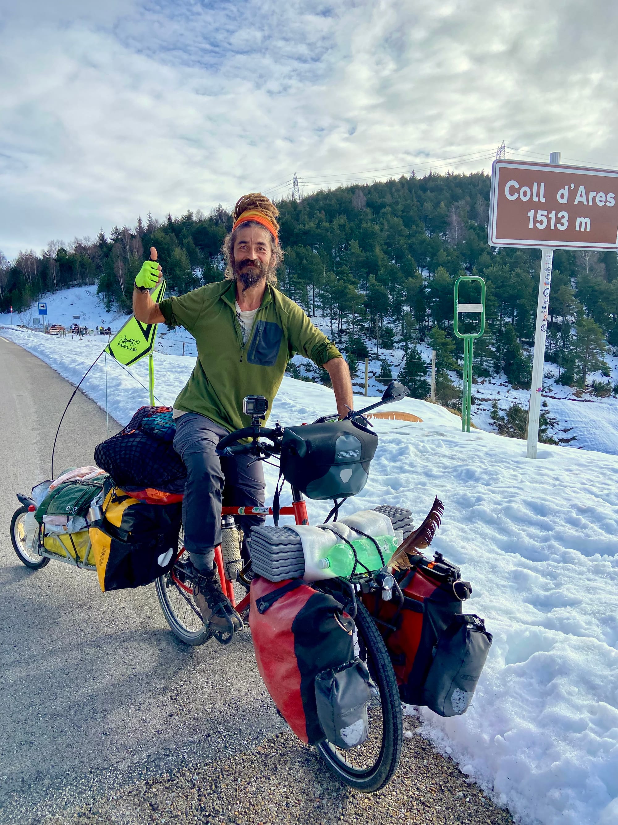 Neděle 4. ledna: Ráno jsme vylezli z vyhřátého stanu opět celkem brzy. Vypili jsme limonádu, posnídali a Kačenka stihla i uvařit rizoto k obědu. Přesunuli jsme se do blízké kavárny a po čtyřech kafích a dvou croissantech jsme vyrazili na cestu – bylo 12:12 a před námi desetikilometrové stoupání. Na zasněžený vrchol průsmyku Col d'Ares ve výšce 1 513 m n. m. jsme dorazili kolem 14:00. A pak už jen dolů a dolů...