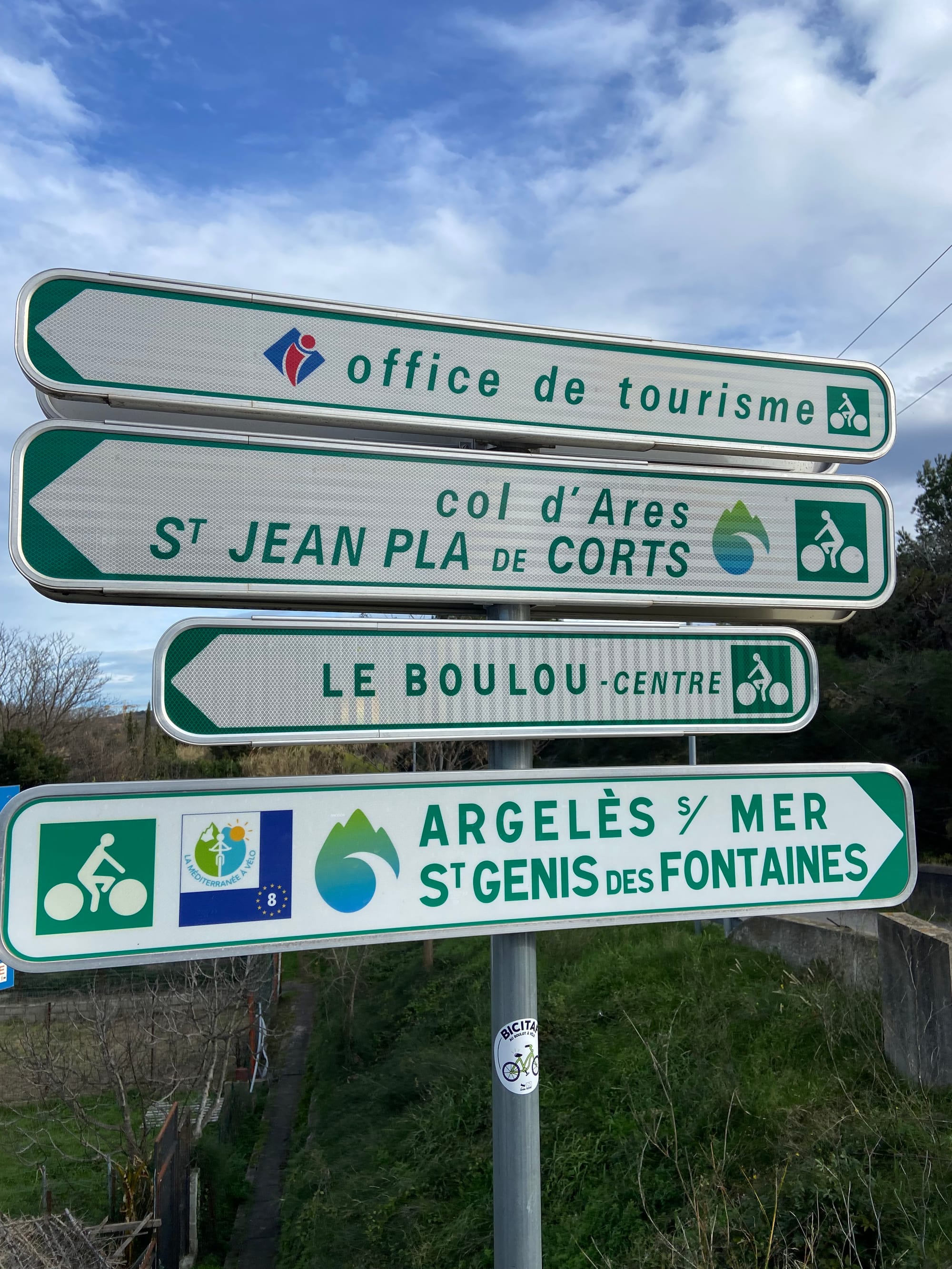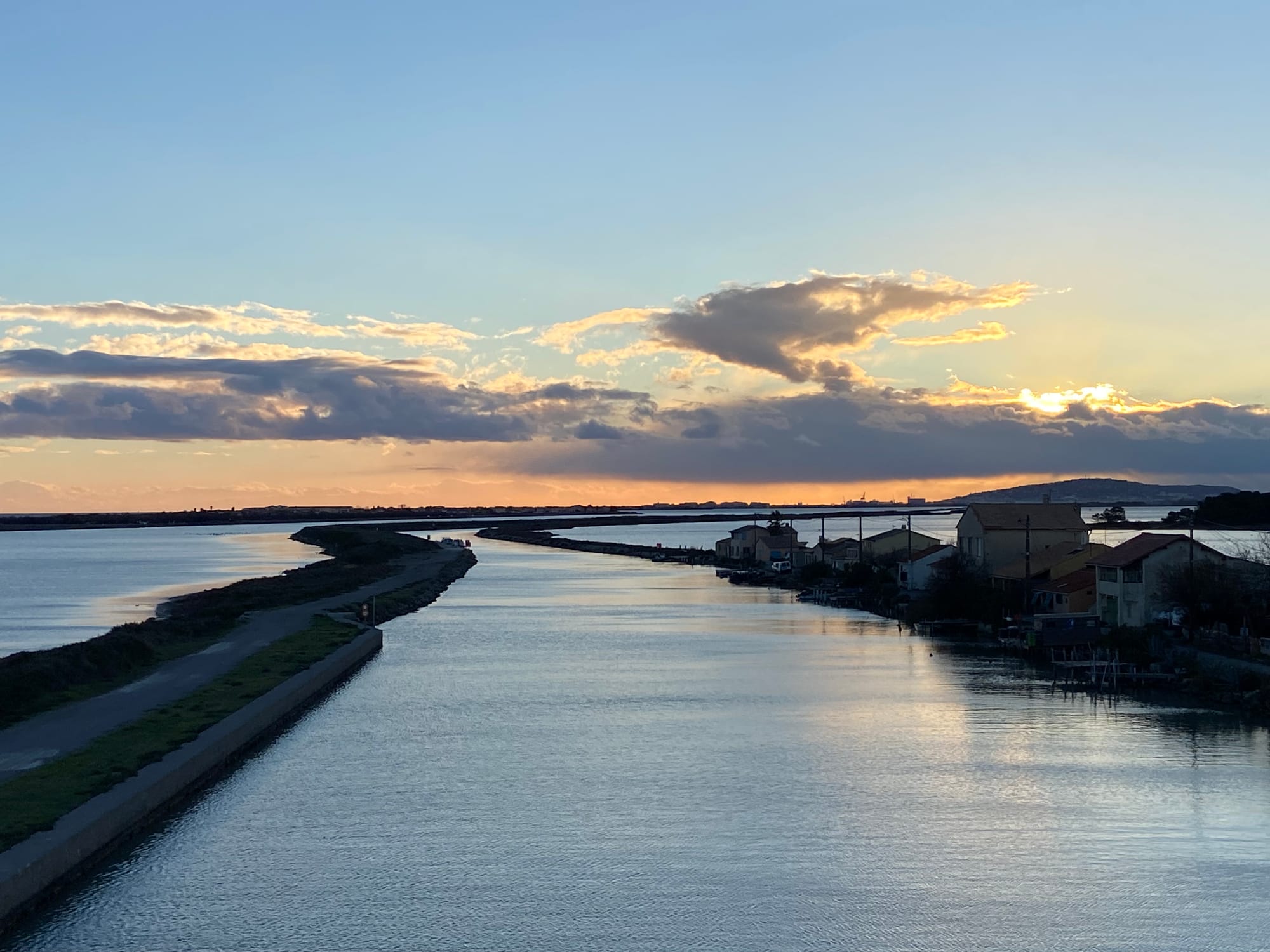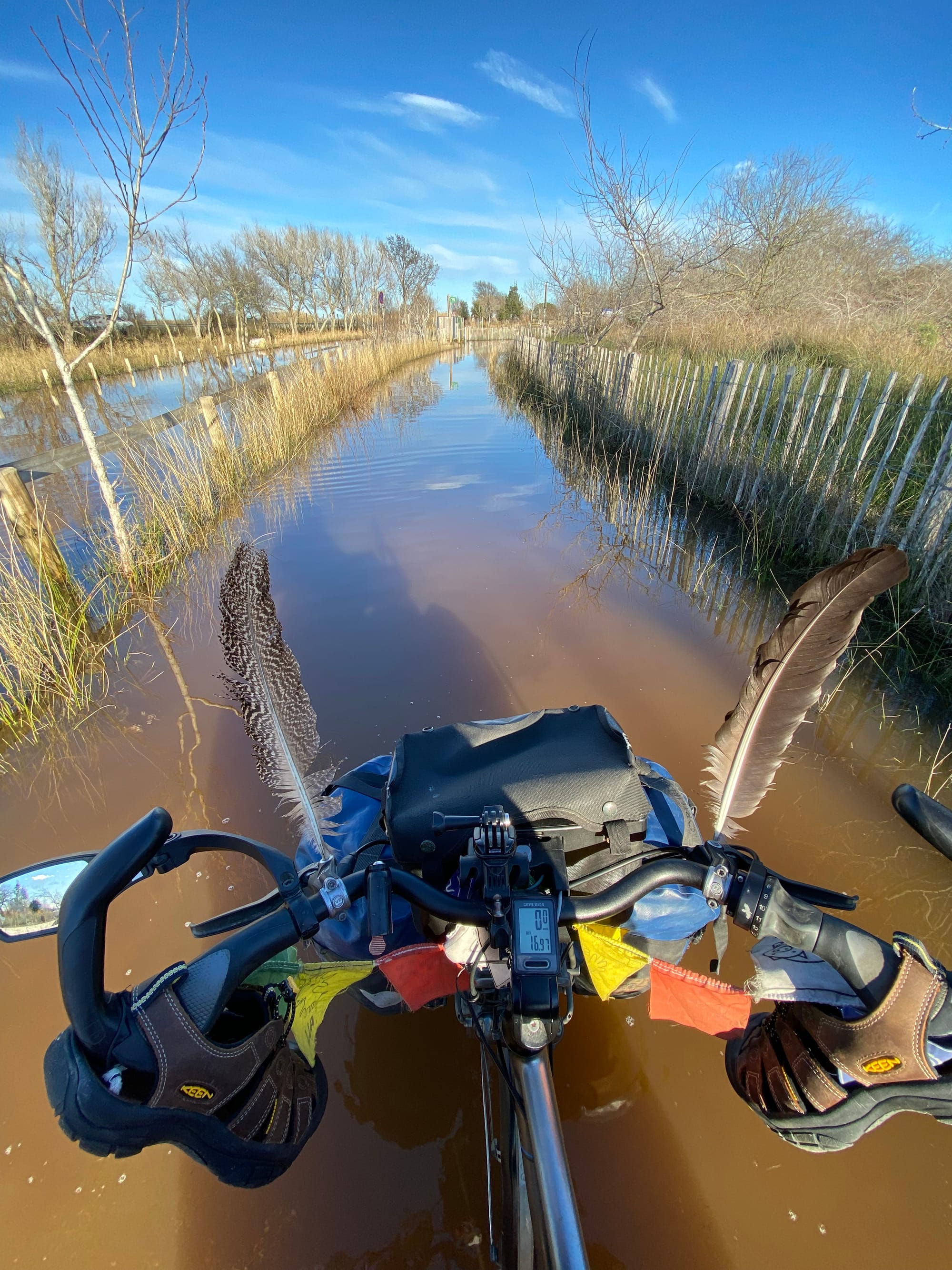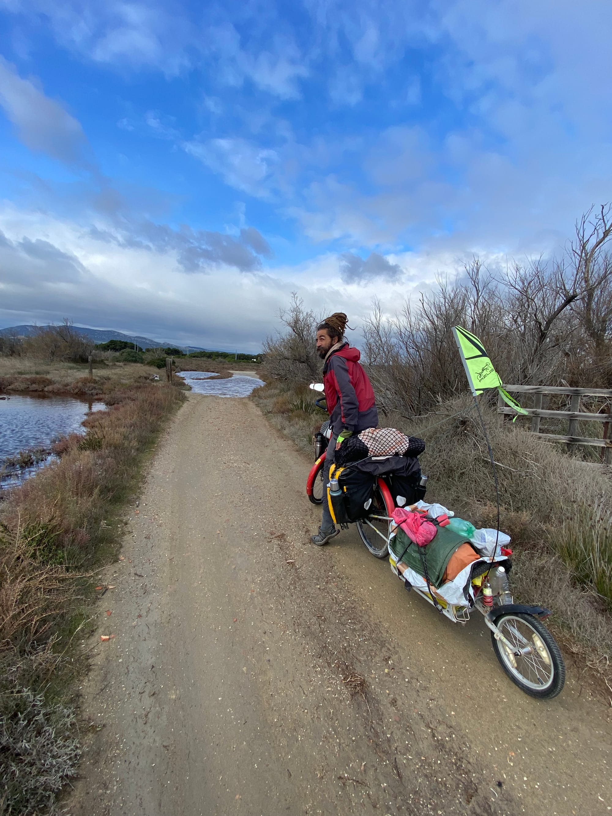 Pondělí 9. února: Decathlon pneumatiku na Katjino zadní kolo neměl, a tak jsme se rozhodli riskovat a jet dál do Marseille. Krásnou cyklostezkou E 17, kolem nás nic, než příroda. No a pak Katja konečně přišla na příčinu divného zvuku – zlomily se rovnou dva šrouby předního nosiče. Naštěstí máme stále po ruce plastové stahovací pásky – ty nás na nějaký čas zachránily. Zároveň se ozvali Cyril se Sofií, že u nich můžeme přespat. Do města Istres to bylo přesně 18 km.