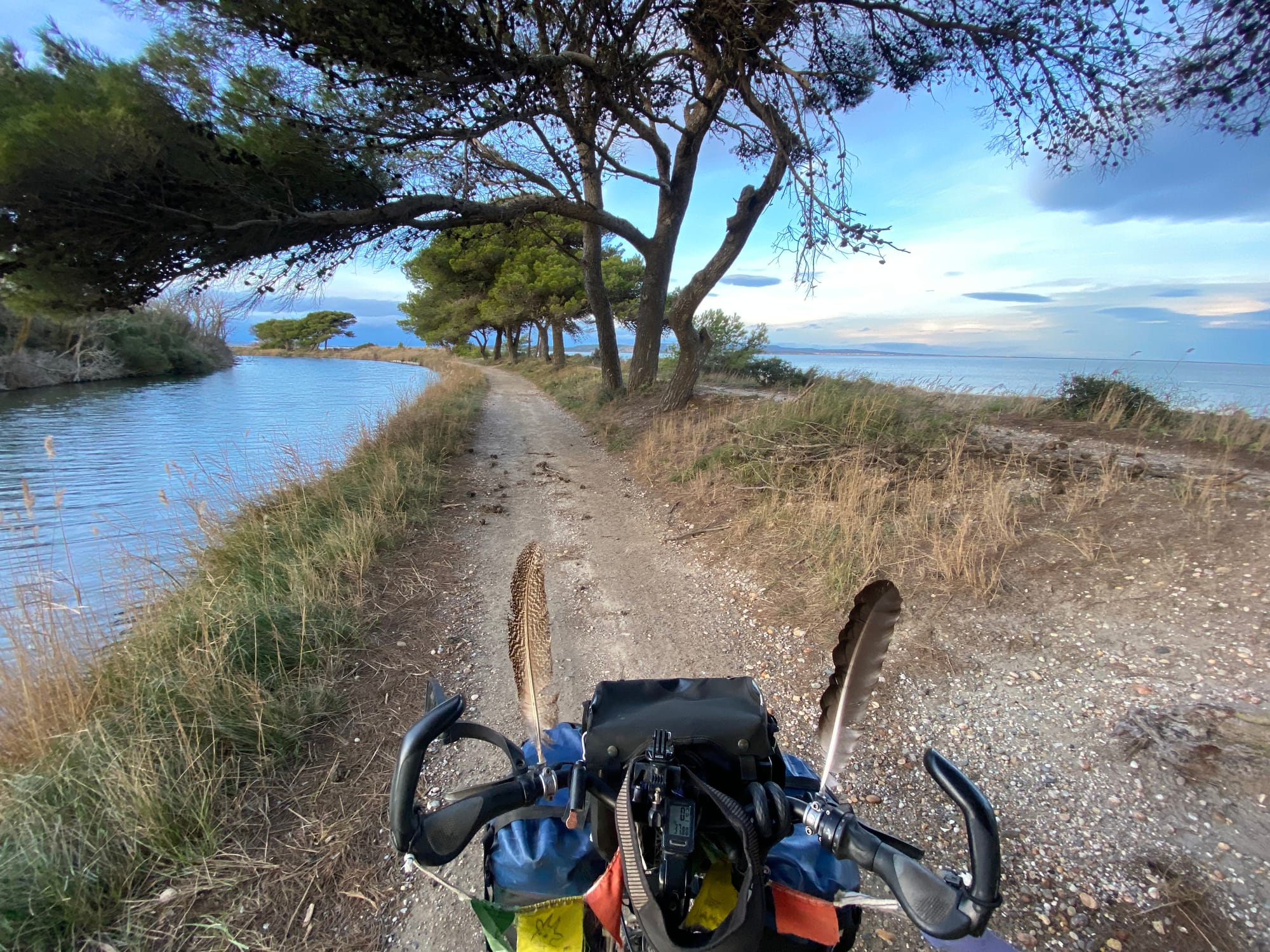 Pátek 6. února: Začátek cesty s novými spacáky. Ve 14:00 jsme konečně šlápli do pedálů a po měsíčním odpočinku, během něhož jsme se dočkali zásilky našich vytoužených spacáků Patizon G 800 jsme opět na cestě. Je 22:11 a my ležíme ve stanu 43 km od baráčku Kristýny a Freda. Před námi je tichý Canal du Rhône à Sète a za námi hlučná silnice. Kousek od nás houká sova. Po měsíci spaní v posteli jsme si konečně zalezli do svých nových spacáků.