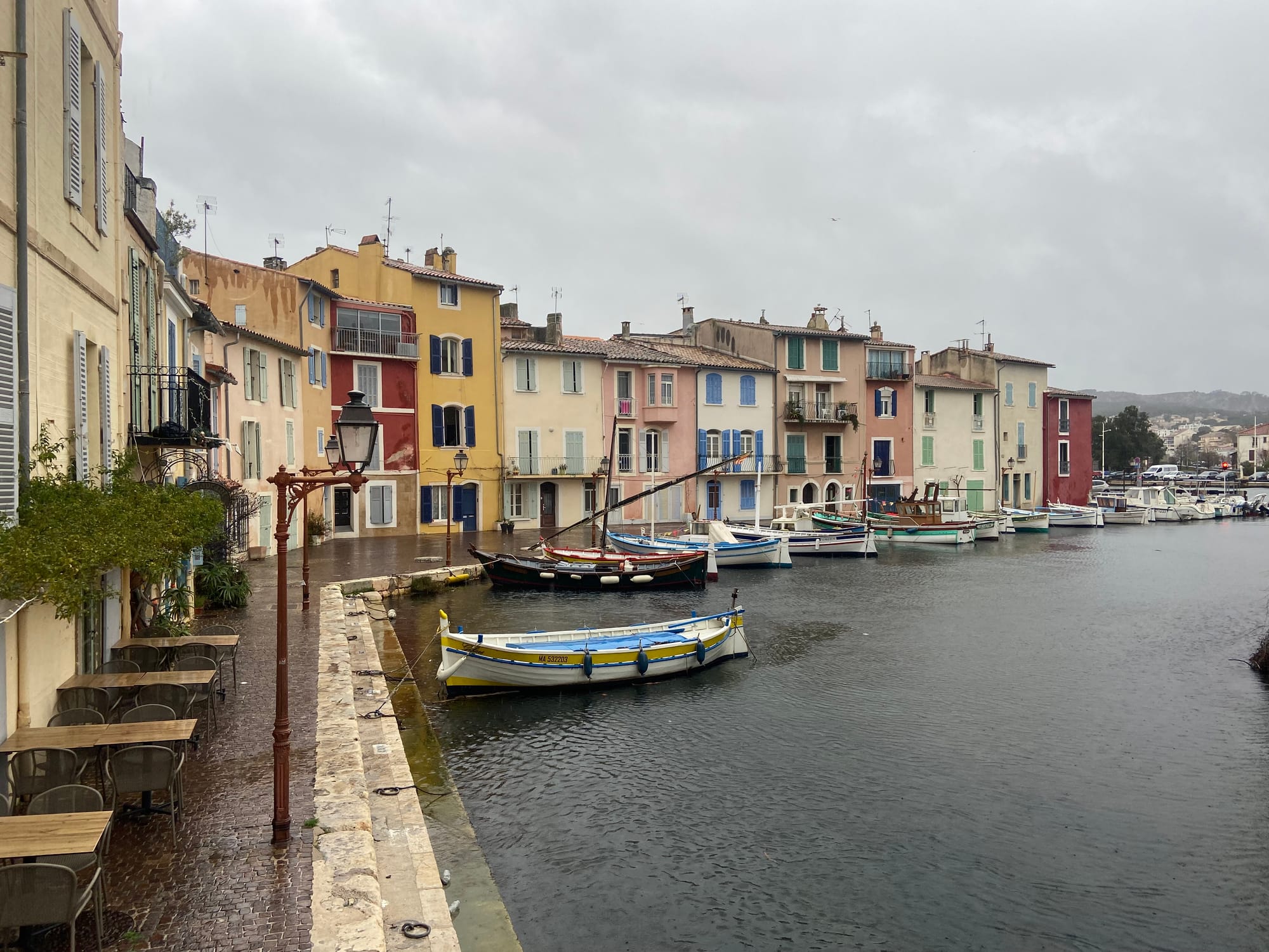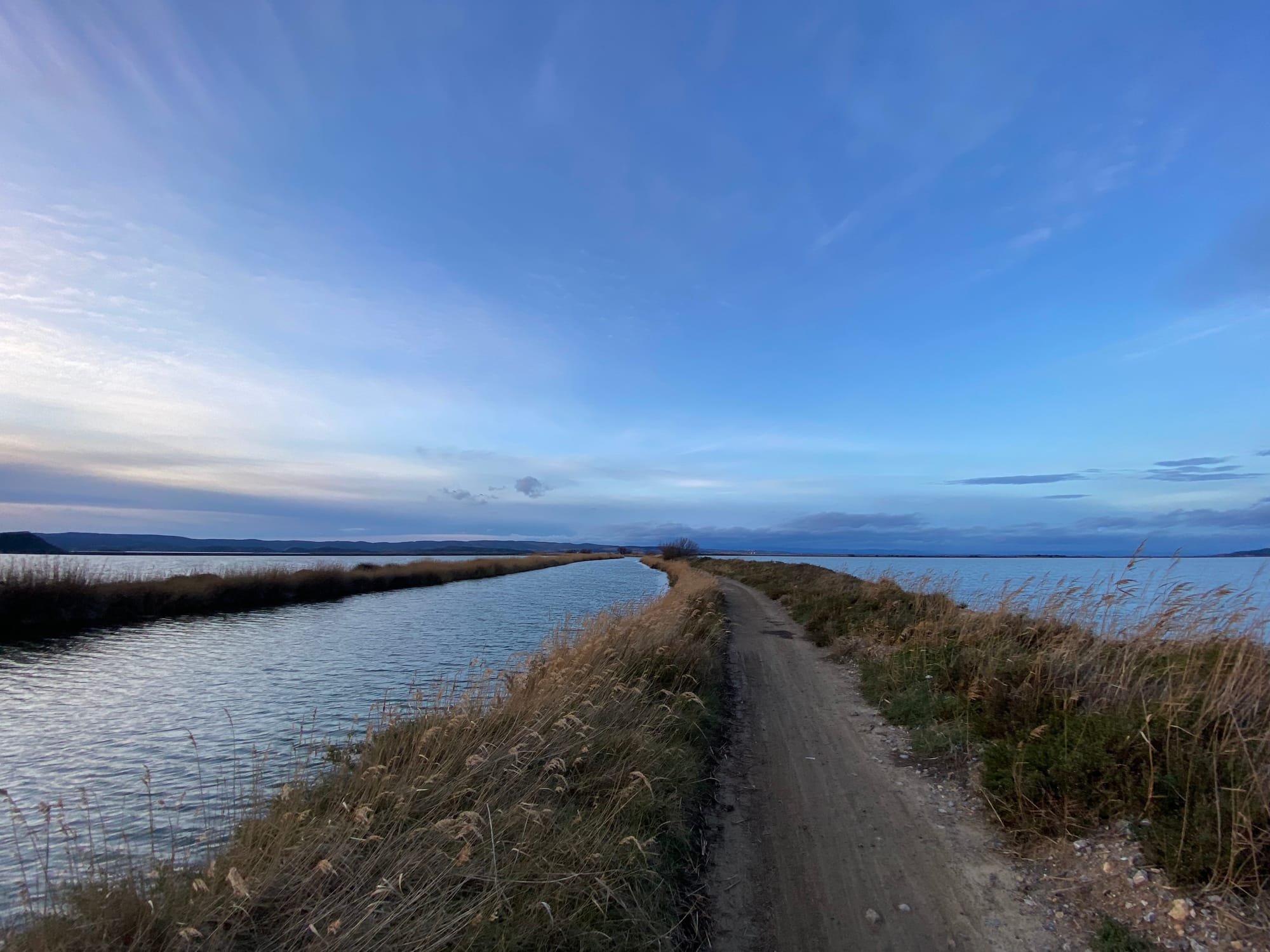 Sobota 14. února: Vyrazili jsme o kus dál. U města Châteauneuf-les-Martigues jsme odbočili doleva k jezeru Étang de Berre – mezi Châteauneuf a Marignane totiž tvoří kus pobřeží rozlehlé mokřiny, přes něž vede nezpevněná cesta. Jak jsme byli unavení z dlouhé jízdy po hlučné silnici, úplně jsme zapomněli, že doposud skoro každý den pršelo. Ale dali jsme to – 3 km jsme napůl tlačili a napůl jeli. Horká sprcha za to stála.