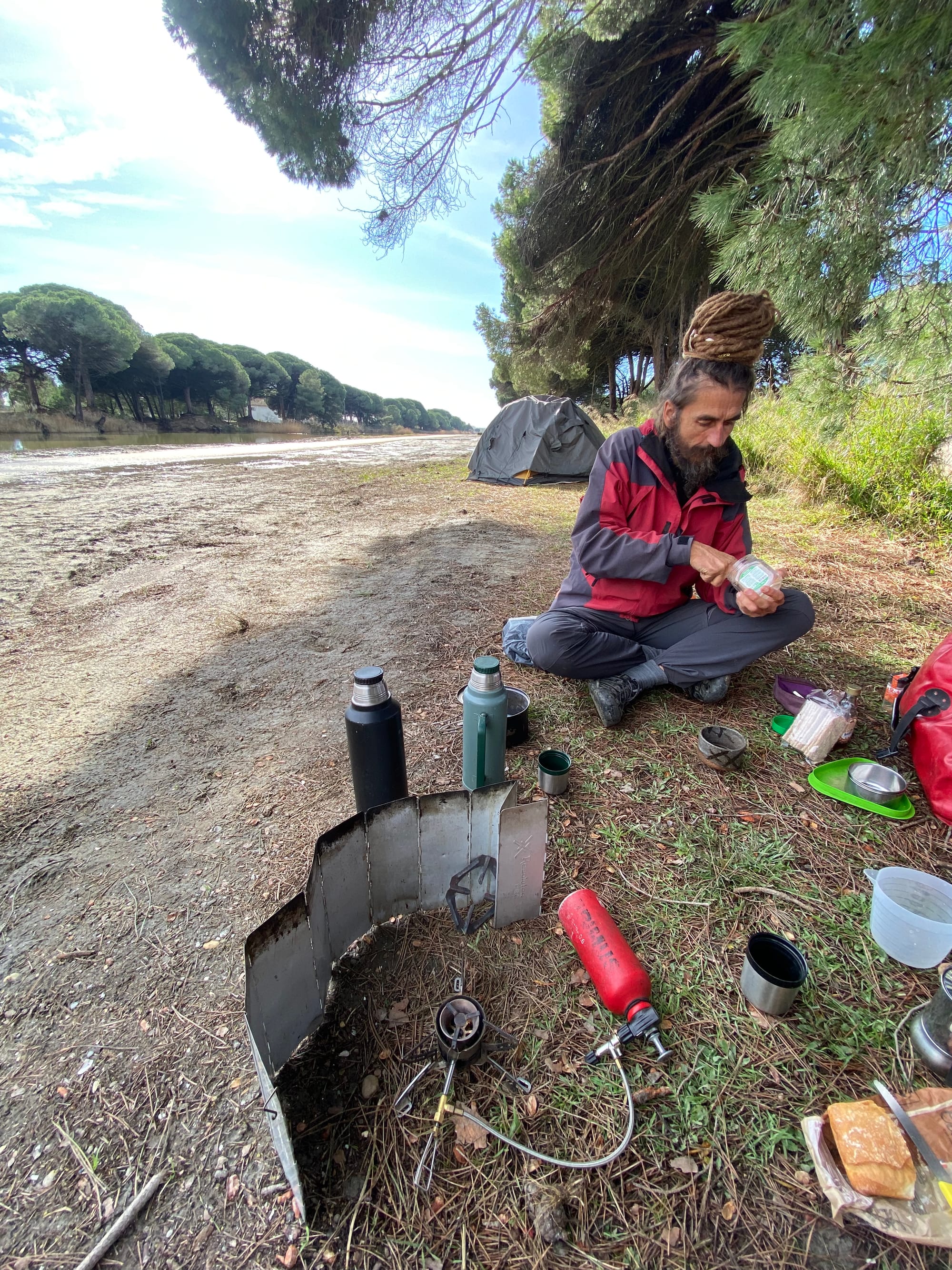 Nejdřív jsme se zastavili v kavárně, kterou vlastní rodina z Hondurasu, a rozhodovali se, co dál. Pořídili jsme plynové bomby, nakoupili a pak si ještě objednali pizzu. Byla tak tenká, že nám k ní dali nůžky. Via Verde (cyklostezkou vytvořenou z bývalé železniční dráhy) jsme dojeli na vybraný plácek u sportovního areálu. V přilehlé restauraci slavili narozeniny a majitel nám přinesl zákusky. Všude se najdou hodní lidé. Sedíme ve stanu, pochutnáváme si na dobrotách a usrkáváme černý čaj...