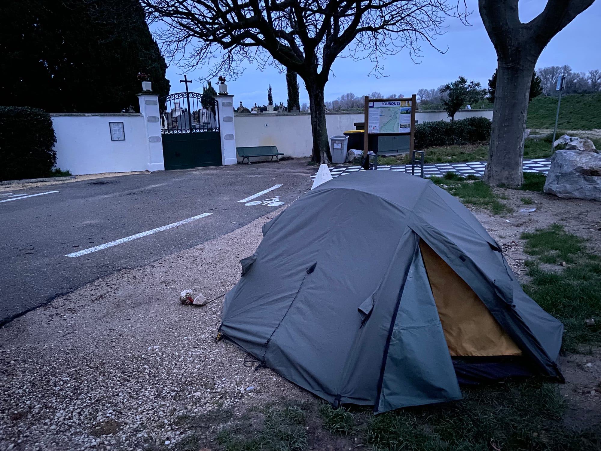 Pondělí 23. února: Těsně před Lorgues jsme potkali dva starší cyklisty – 79letého Kaliforňana žijícího půl roku tady a půl roku za mořem, a jeho o šest let mladšího kamaráda. Kola měli samozřejmě bez motoru. Krásná inspirace. Nocujeme pod olivovníkem za plotem soukromého pozemku – majitel mluvil anglicky a neodmítl nás.