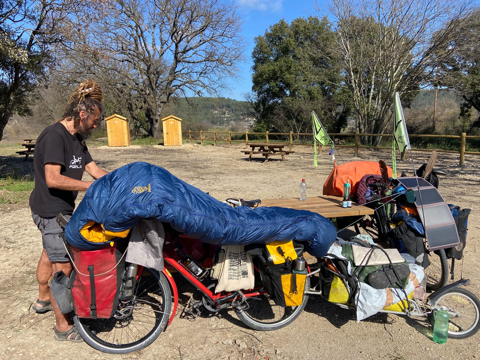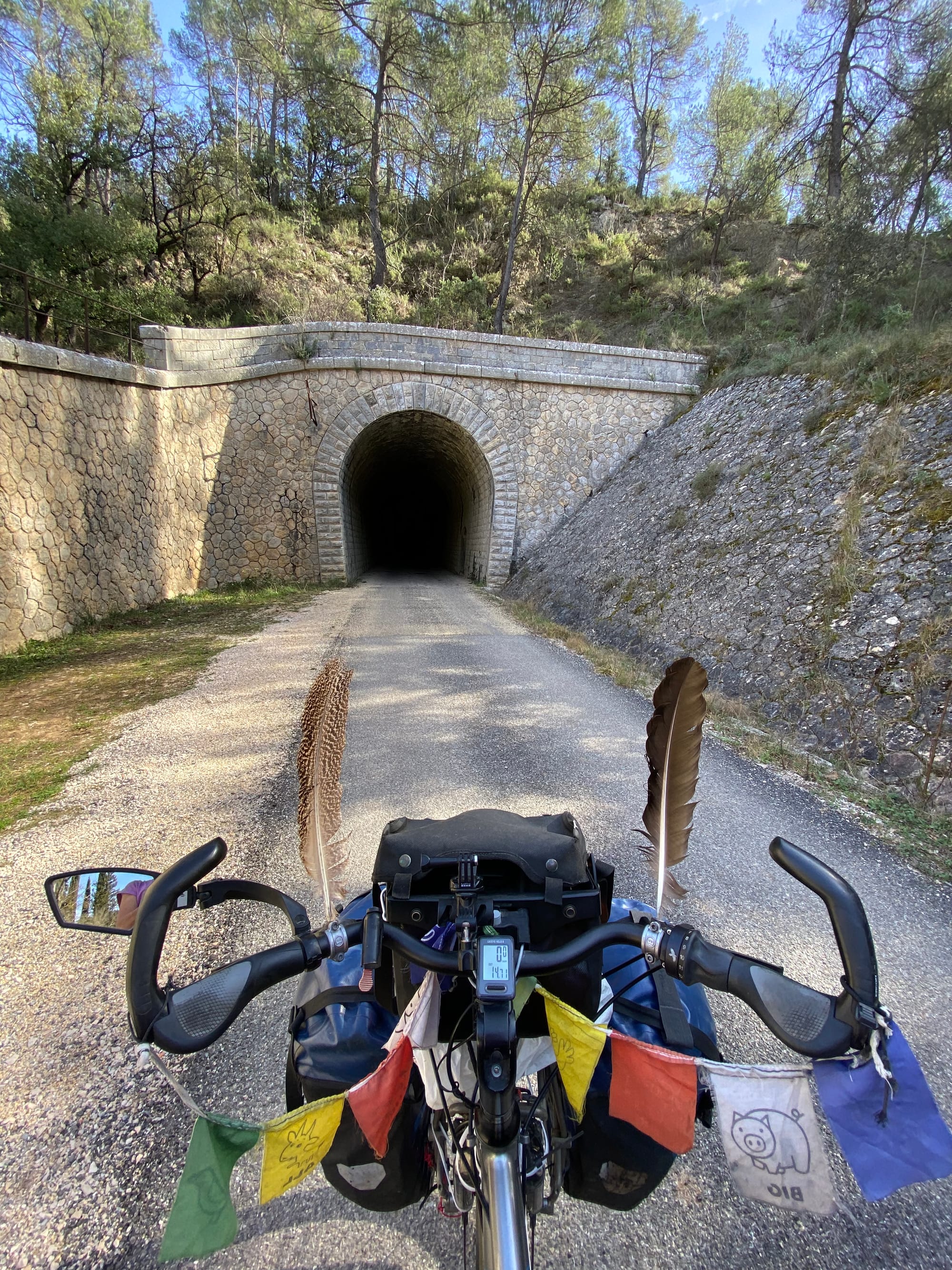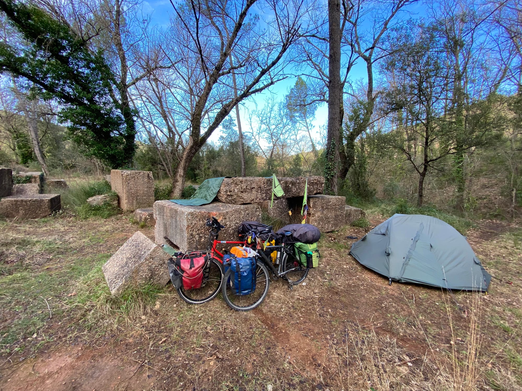 Neděle 22. února: I přes start ve 12:22 jsme ujeli 47,5 km. Ležíme ve stanu v provensálských horách na kraji cyklotrasy EuroVelo 8 – příjemně unaveni po překrásné jízdě. Dnešek byl jedním z nejkrásnějších dní. Většinu dne jsme jeli po staré upravené železniční dráze.