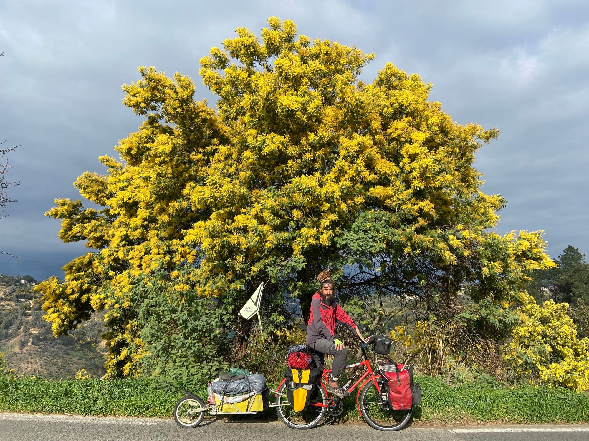 Pátek 27. února: Než se nám usušil stan, vykoupali jsme se v ledové horské říčce. Pak jsme si dali 6 km do kopce po Cestě mimózy – celé okolí bylo zeleno-žluté a plné vonících květů. Na vrcholu jsme si dali dvě kávy a pak už zasloužený 10km sešup dolů k moři a dál do Cannes.