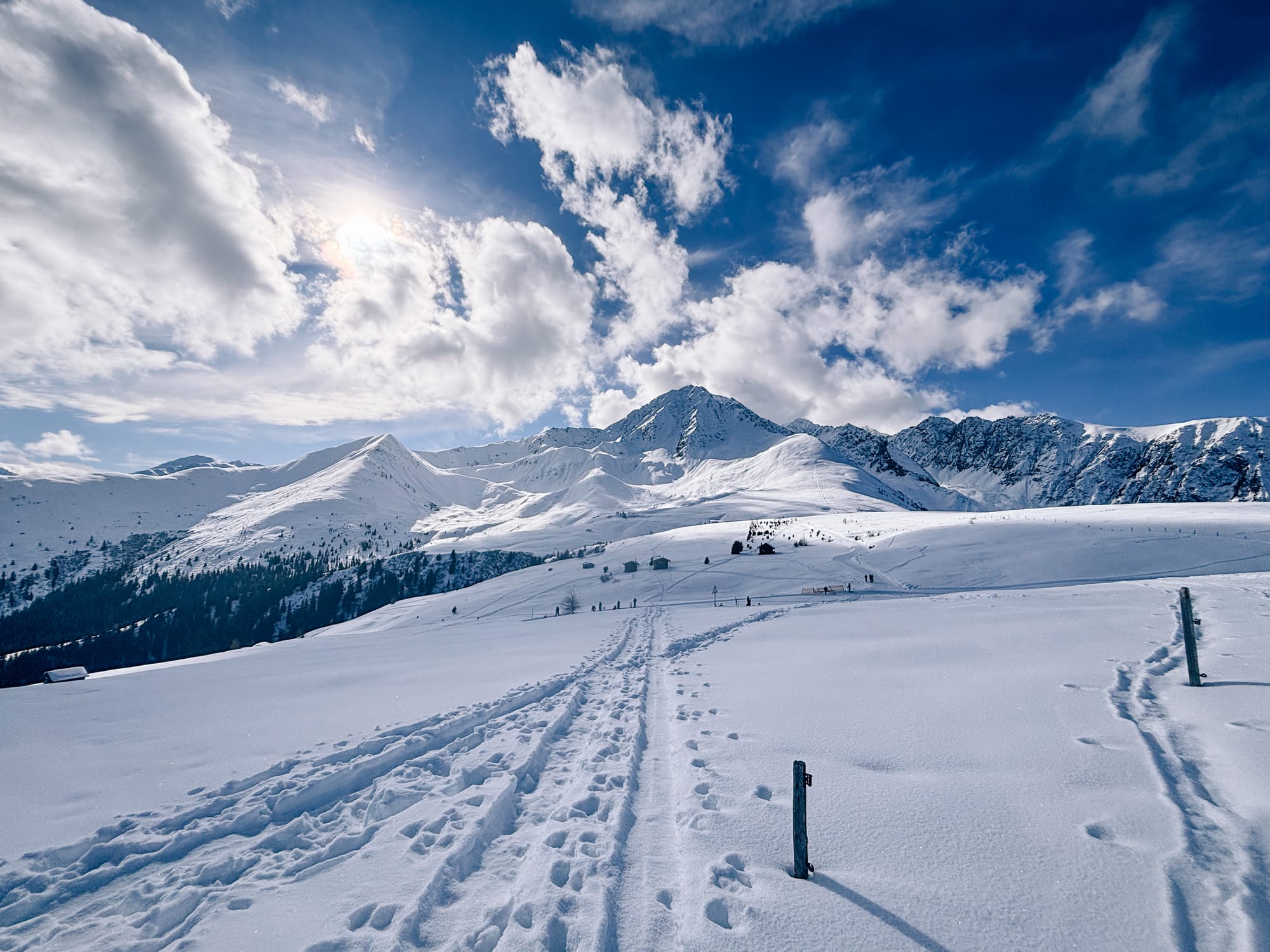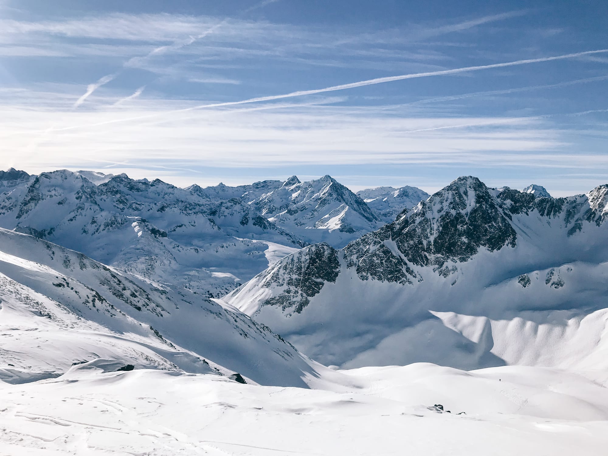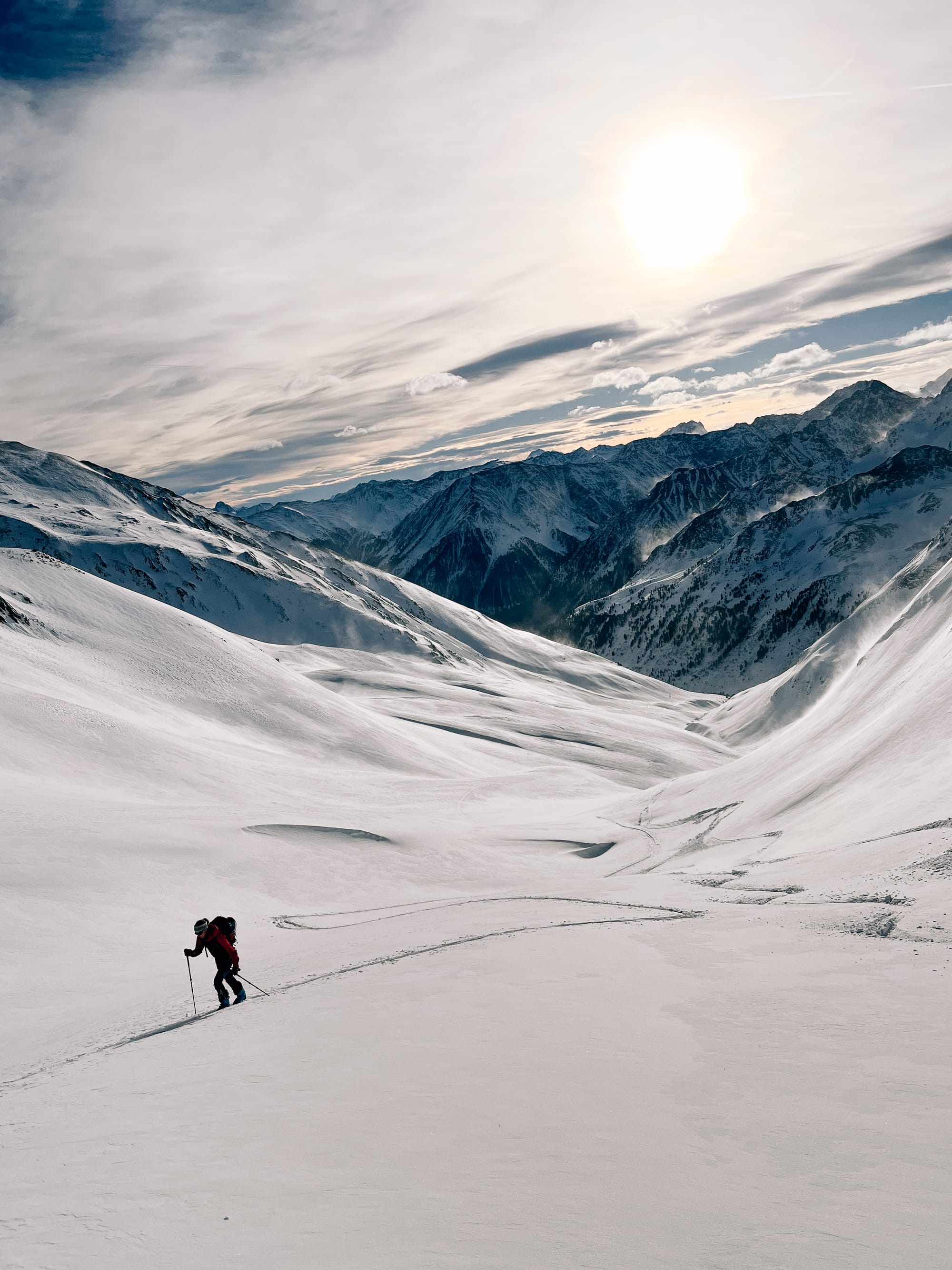 Pokud tě to baví víc na pásech, než špičkama dolů, příjemnou túrou, na kterou se můžou vypravit i mírně pokročilí je Rietzer Grießkogel (2 884 m n. m.) ze sedla Kühtai. Nenech se odradit, když u parkoviště neuvidíš moc sněhu. V údolí Klammbachtal se i přes jeho jižní orientaci drží sníh skvěle a prakticky jistě tudy půjde hezky nabrat metry, i je později sjet dolů. Ostatně, po deseti minutách šlapání ti zmizí z očí jak silnice, tak vědomí, že pár stovek metrů od tebe se nachází rozlehlé lyžařské středisko. Rietzer Grießkogel leží v nejsevernější části Stubaiských Alp a scenérie tomu odpovídá. Po přibližně 600 výškových metrech přichází na túře kritické místo, kde stojí za to zvážit lavinovou situaci. Je jím strmější pasáž vedoucí do JV rampy, která ve finále nabídne nejhezčí část sjezdu a po ní už frčíš volnými cikcaky do sedla (~2 750 m). Většina skialpinistů tu končí a přezouvá se na sjezd, pokud ale toužíš po kříži, je to ještě asi 20 minut po hřebeni bez lyží směrem na východ. Tady je dobré myslet na to, že budeš sjíždět převážně v jižních a jihovýchodních orientacích, tak raději za studena, než začne sníh krustovatět. Sjezd až do údolí Klammbachtalu je nejhezčí, v údolí už často najedeš do stopy, která tě dovede zpátky k autu. Skvělou delší alternativou nebo samostatnou kratší variantou pro dny s horší lavinovou předpovědí je túra jen do sedla Kreuzjoch (2 563 m n. m.).