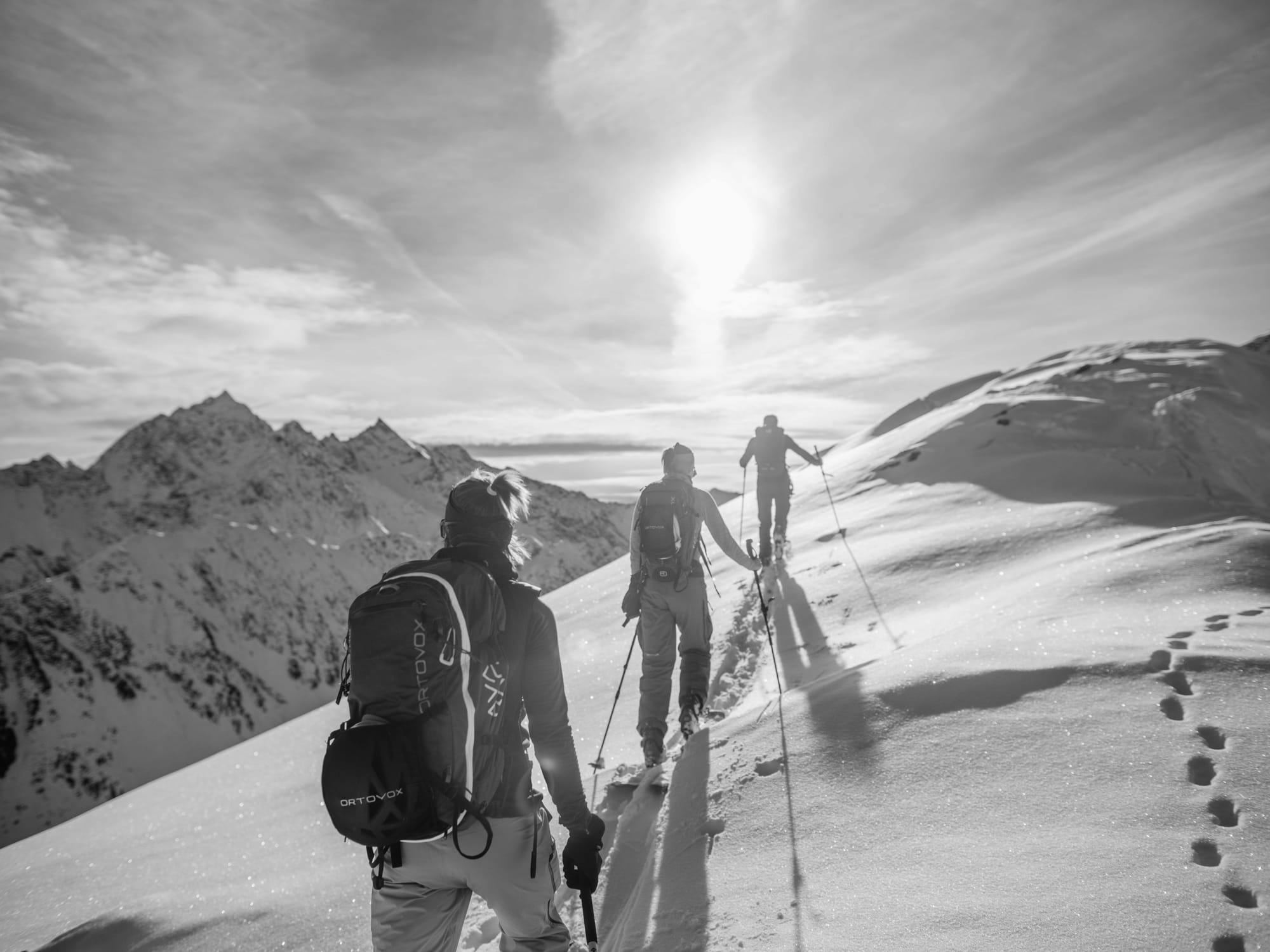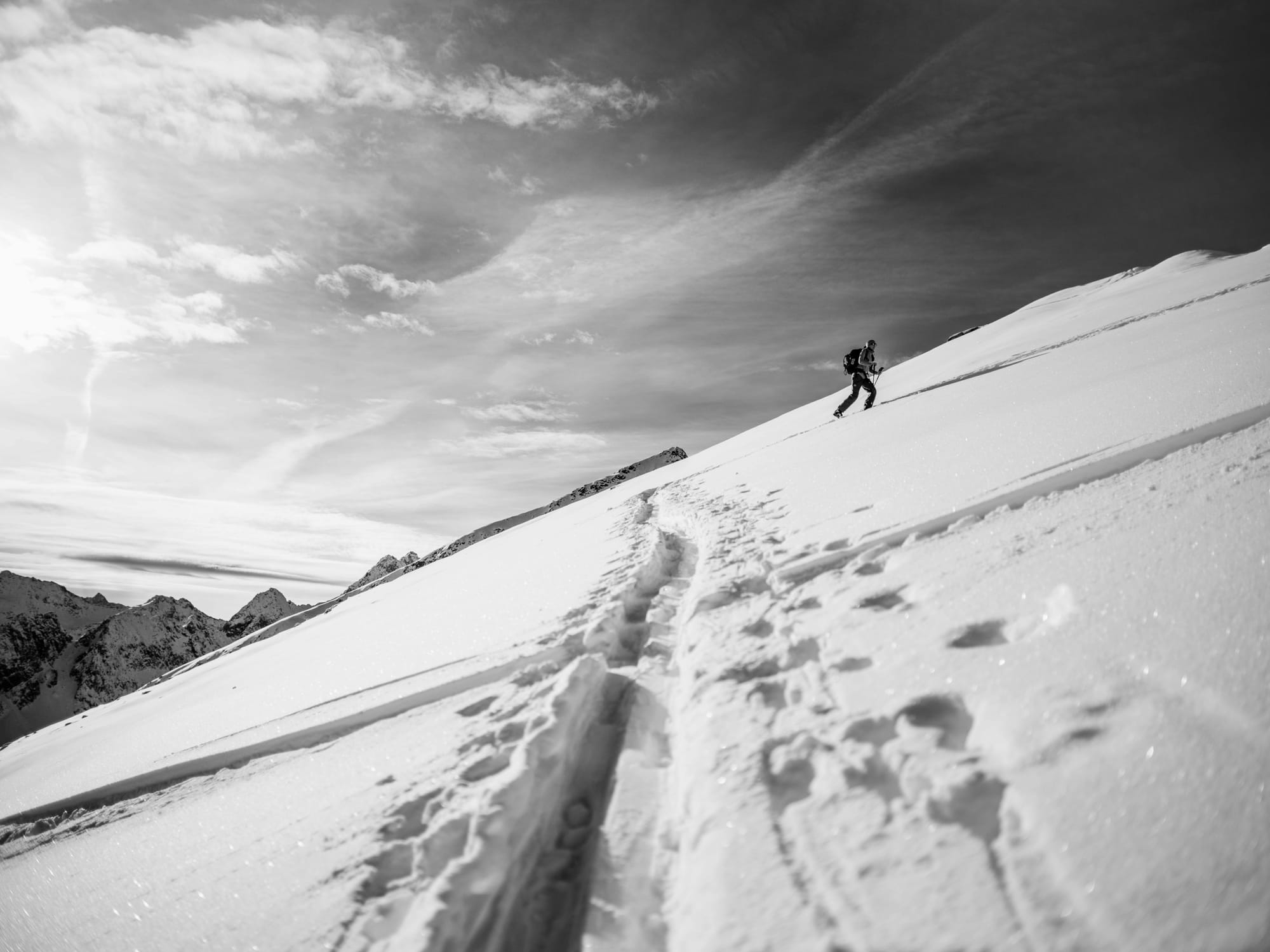 Pokud tě to baví víc na pásech, než špičkama dolů, příjemnou túrou, na kterou se můžou vypravit i mírně pokročilí je Rietzer Grießkogel (2 884 m n. m.) ze sedla Kühtai. Nenech se odradit, když u parkoviště neuvidíš moc sněhu. V údolí Klammbachtal se i přes jeho jižní orientaci drží sníh skvěle a prakticky jistě tudy půjde hezky nabrat metry, i je později sjet dolů. Ostatně, po deseti minutách šlapání ti zmizí z očí jak silnice, tak vědomí, že pár stovek metrů od tebe se nachází rozlehlé lyžařské středisko. Rietzer Grießkogel leží v nejsevernější části Stubaiských Alp a scenérie tomu odpovídá. Po přibližně 600 výškových metrech přichází na túře kritické místo, kde stojí za to zvážit lavinovou situaci. Je jím strmější pasáž vedoucí do JV rampy, která ve finále nabídne nejhezčí část sjezdu a po ní už frčíš volnými cikcaky do sedla (~2 750 m). Většina skialpinistů tu končí a přezouvá se na sjezd, pokud ale toužíš po kříži, je to ještě asi 20 minut po hřebeni bez lyží směrem na východ. Tady je dobré myslet na to, že budeš sjíždět převážně v jižních a jihovýchodních orientacích, tak raději za studena, než začne sníh krustovatět. Sjezd až do údolí Klammbachtalu je nejhezčí, v údolí už často najedeš do stopy, která tě dovede zpátky k autu. Skvělou delší alternativou nebo samostatnou kratší variantou pro dny s horší lavinovou předpovědí je túra jen do sedla Kreuzjoch (2 563 m n. m.).