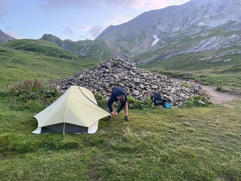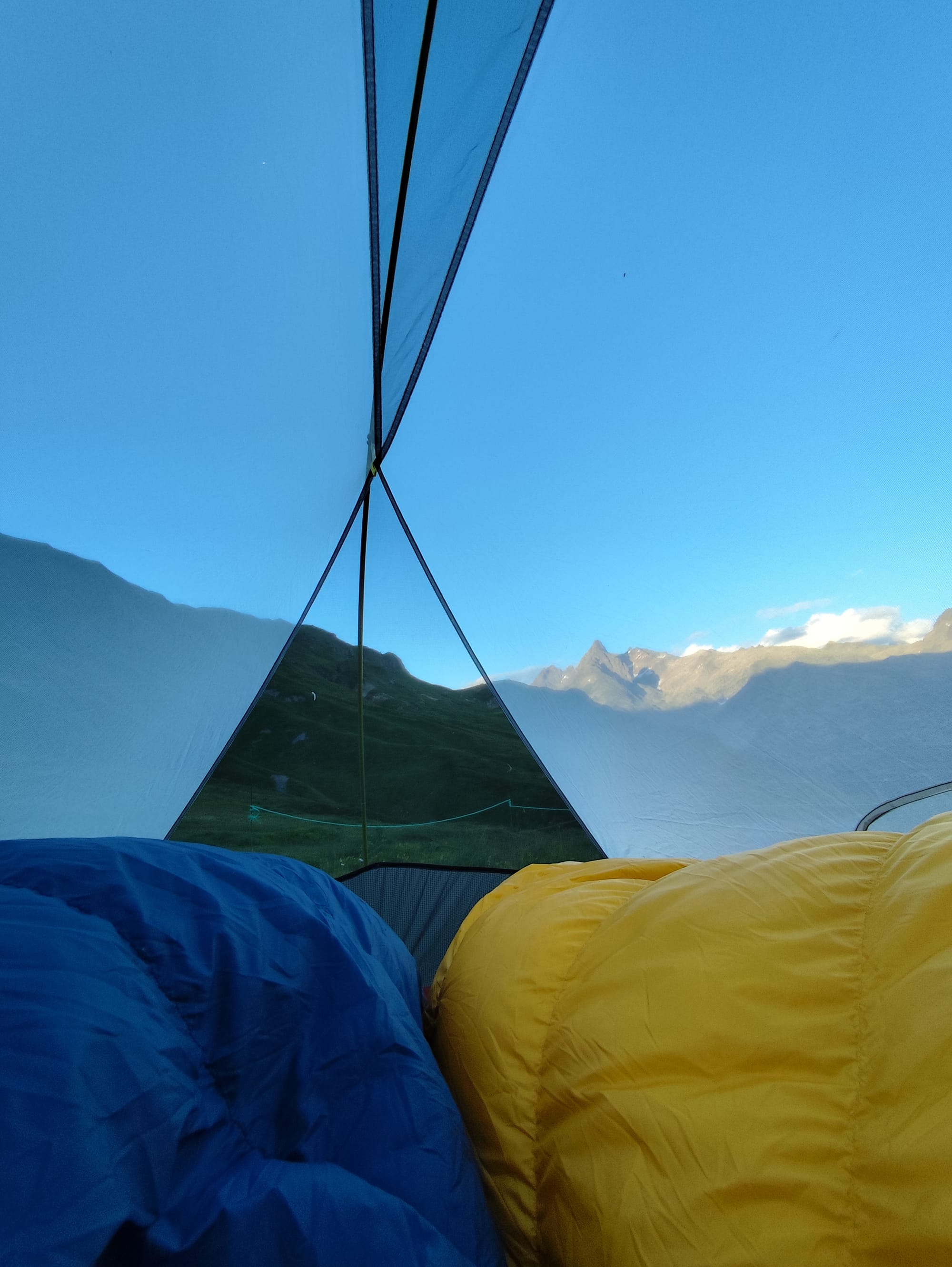 Keď sme unavení a šťastní dorazili ku chate Refuge de la Leisse, mali sme za sebou takmer 30 kilometrov s dobrým prevýšením. Na druhý deň sme sa utáborili pod sedlom Col de Chavière, najvyšším bodom na trase. Večer pred spaním som na telefóne skontroloval predpoveď počasia a zhrozil som sa. Hlásili silné búrky a vietor, ktoré sa mali začať už pred obedom a trvať ďalšie tri dni. Dlho sme premýšľali, čo s tým. Ranný budíček o štvrtej by nás dostal do sedla včas, ale ani jednému sa nám nechcelo. Rozhodli sme sa počkať a ráno sme vstali o siedmej.