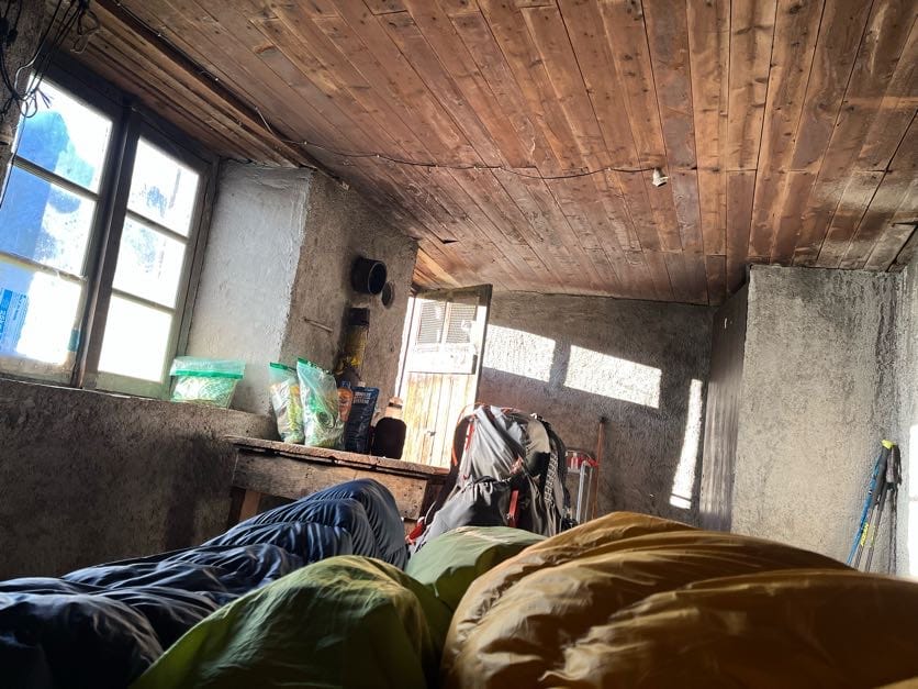 Celý večer som s tým bojoval a cítil som sa, akoby som podvádzal. Ale koho? To som nevedel. Vonku bolo naozaj škaredo, hmla, občasný dážď, roztopený sneh a zima, ktorá sa zalievala pod kožu. Teplá sprcha a teplo perín nám sľubovali odpočinok. Ráno, vyspatí do ružova, sme vyrazili. A ja, naplnený radosťou z novej sily, som opäť začal snívať o zaspávaní v najkrajšom hoteli na svete: pod širákom, so svetlom žiarivých alpských hviezd.